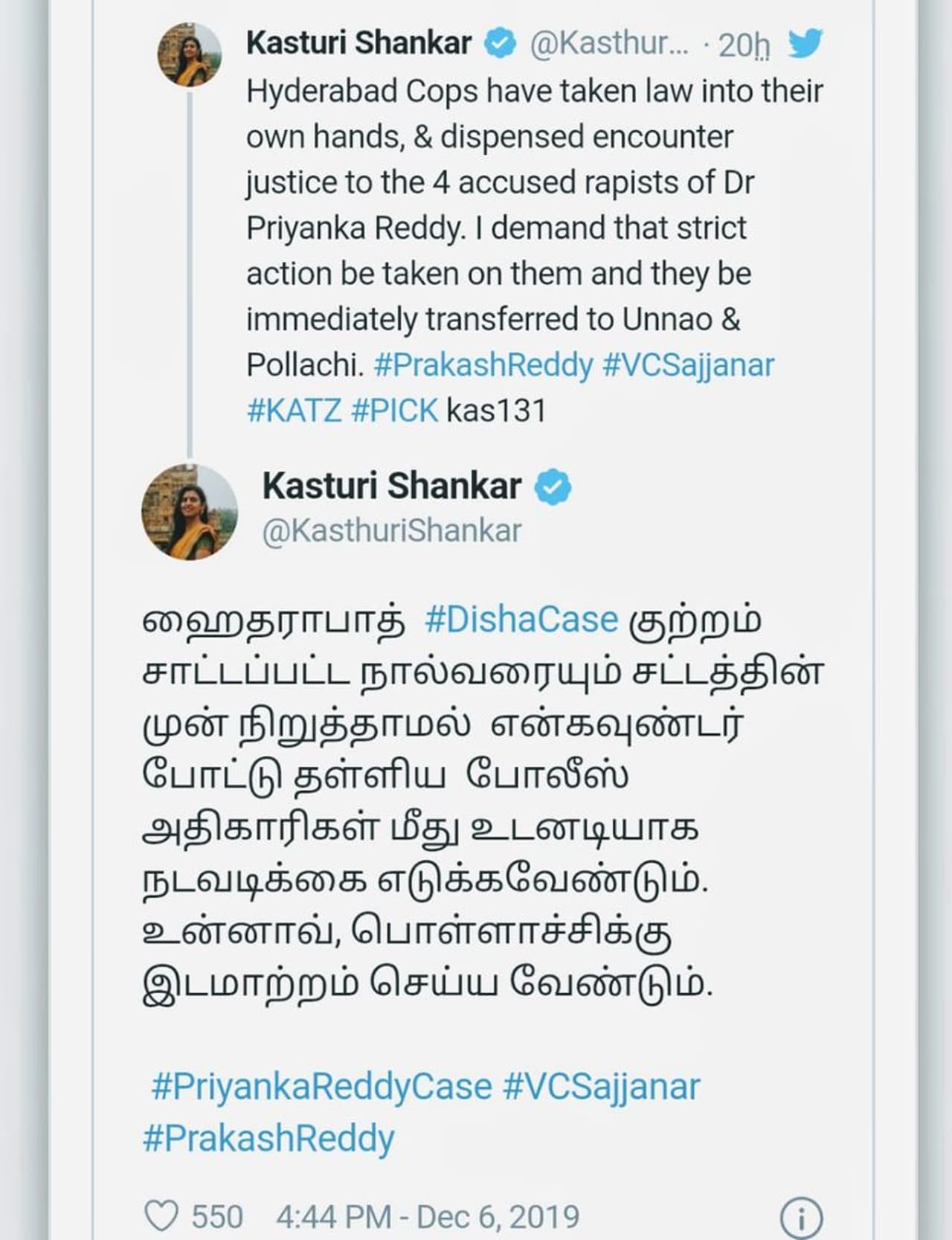 அதே நேரத்தில் இதுபோன்ற என்கவுண்டர் சம்பவங்கள் தொடர்ந்தால் தான் பெண்களுக்கு எதிரான வன்கொடுமைகள் குறையும் எனவும் பொள்ளாச்சி பாலியல் வழக்கில் ஏன் இதுபோன்ற நடவடிக்கையை போலீசார் எடுக்கவில்லை எனவும் கருத்துக்கள் எழுந்து வருகிறது . இந்நிலையில் நடிகை கஸ்தூரி தனது டுவிட்டர் பக்கத்தில் என்கவுண்டர் தொடர்பாக கருத்து ஒன்றை பதிவிட்டுள்ளார், அதில் குற்றம் சாட்டப்பட்ட நால்வரையும் சட்டத்தின் முன் நிறுத்தாமல் என்கவுண்டரில் போட்டுத் தள்ளிய போலீஸ் அதிகாரிகள் மீது உடனடியாக நடவடிக்கை எடுக்க வேண்டும் , உன்னாவ், மற்றும் பொள்ளாச்சிக்கு அவர்களை இடமாற்றம் செய்ய வேண்டும் என பதிவிட்டுள்ளார் .