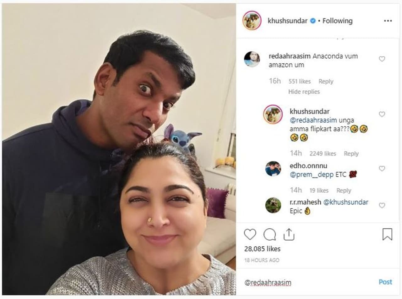 அதைப் பார்த்த நெட்டிசன் ஒருவர் அனகோண்டாவும், அமேசானும் என கமெண்ட் செய்திருந்தார். நடிகை ஸ்ரீரெட்டி விஷாலை அனகோண்டா என சாடியிருந்ததை குறிக்கும் விதமாக அப்படி கமெண்ட் செய்துள்ளார் போல. அதைப் பார்த்து கடுப்பான குஷ்பூ, உங்க அம்மா என்ன FLIPKART-ஆ என பதிலடி கொடுத்துள்ளார்.
