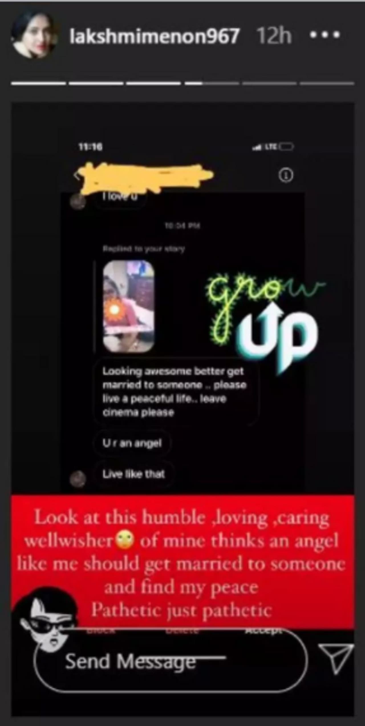 அப்படி லட்சுமி மேனனின் அழகான புகைப்படம் ஒன்றை பார்த்த ரசிகர், “அழகாக இருக்கீங்க... யாரையாவது திருமணம் செய்து கொண்டு தயவு செய்து அழகான வாழ்க்கை வாழுங்கள். தயவு செய்து சினிமாவை விட்டு சென்று விடுங்கள். நீங்கள் ஒரு ஏஞ்சல்" என பதிவிட்டுள்ளார். இதற்கு பதிலளித்துள்ள லட்சுமி மேனன், “ஒரு அன்பான, பாசமான, என்னுடைய நலம் விரும்பி என்ன நினைக்கிறார் என்றால், என்னைப் போன்ற ஒரு ஏஞ்சல் யாரையாவது திருமணம் செய்துகொண்டு அமைதியாக இருக்க வேண்டும் என்று. மிகவும் மோசமான நினைப்பு இது. வளருங்கள்" என நச்சுனு பதிலளித்துள்ளார். அந்த பதிவு தற்போது சோசியல் மீடியாவில் வைரலாகி வருகிறது.