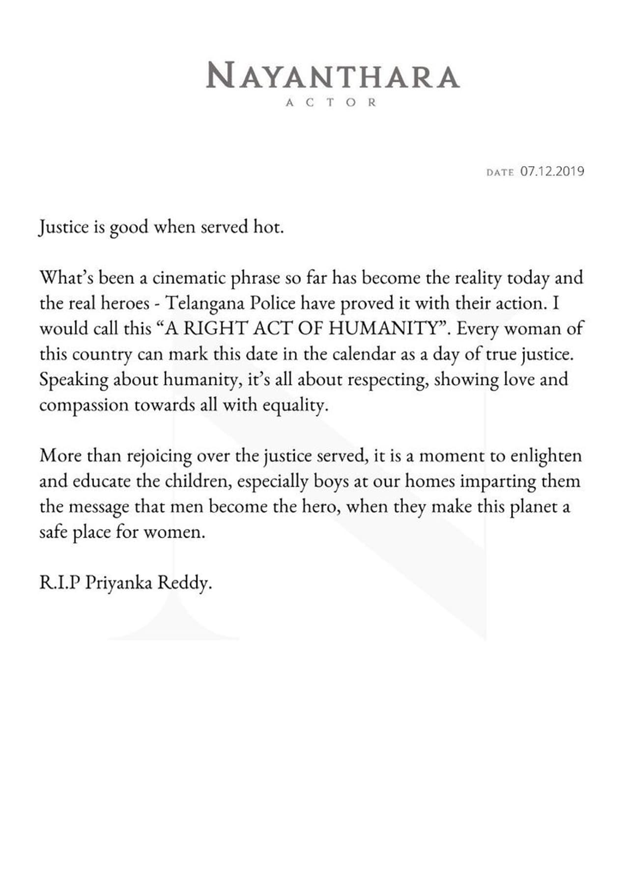 பெண்களை மதிப்பவன் பாதுகாப்பான நாயகன் என்பதை அழுத்தமாக அவன் மனதில் பதிய வைக்க வேண்டும். எதிர்கால உலகை பெண் மீதான வன்முறைக்கு எதிராக அன்பான உலக மாற்ற வேண்டியது நம் கடமை, அப்போது தான் நாம் நிம்மதியான பெருமூச்சுடன் அன்பை அனைவரிடமும் பகிர்ந்து கொள்ள முடியும் என நயன்தாரா தன்னுடைய அறிக்கையில் கூறி, பெண் மருத்துவருக்கு தன்னுடைய இரங்கலையும் தெரிவித்துள்ளார்.