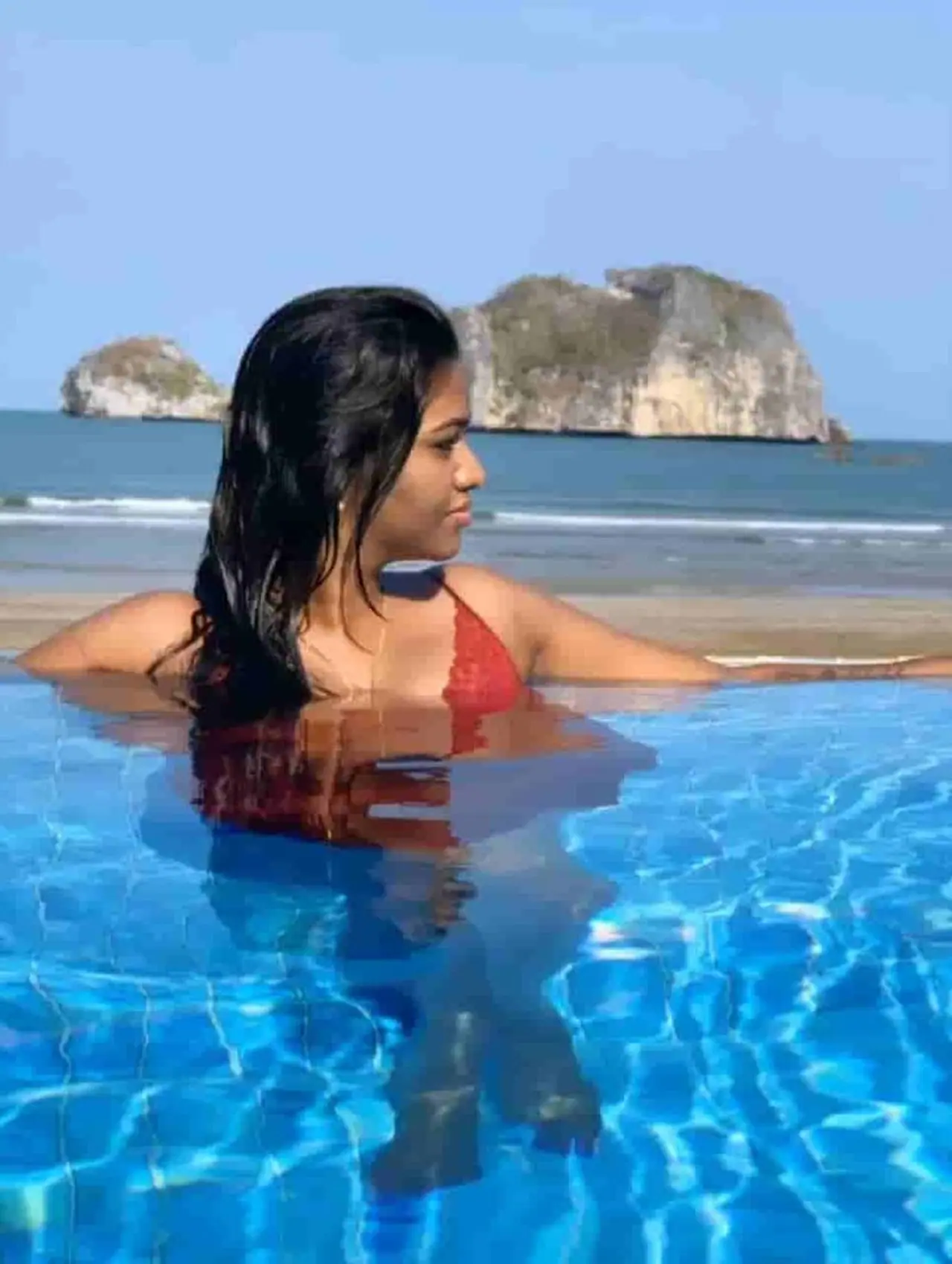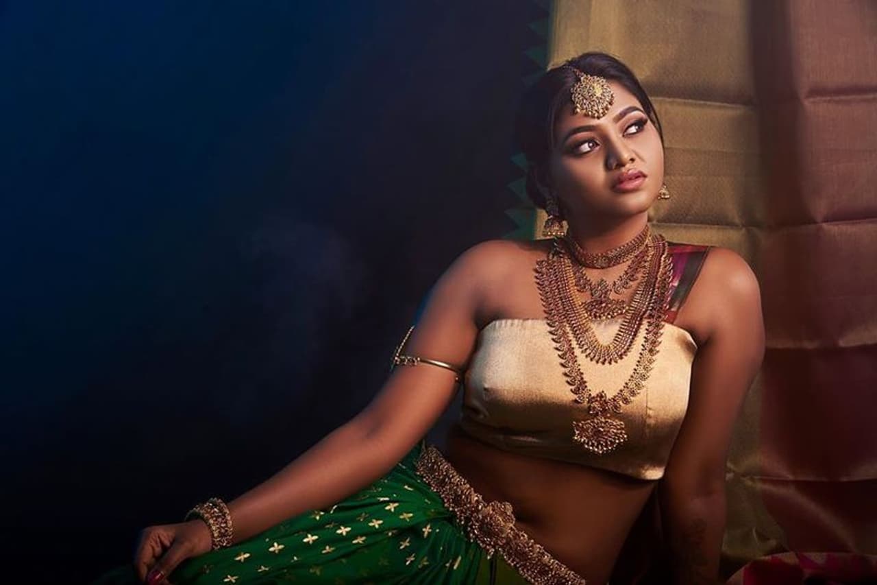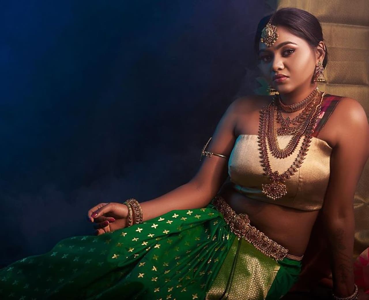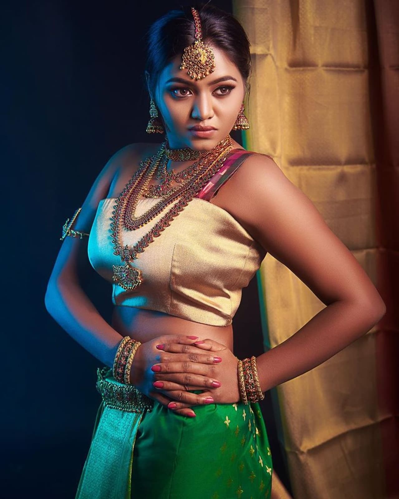 கோல்டன் கலர் ஸ்லீவ் லெஸ் டாப், பச்சை கலர் பாவாடையில் அழகான நகைகள் மற்றும் அளவான மேக்கப்பில் தேவதை போல் ஜொலிக்கும் அந்த போட்டோ சோசியல் மீடியாவில் வைரலாகி வருகிறது.