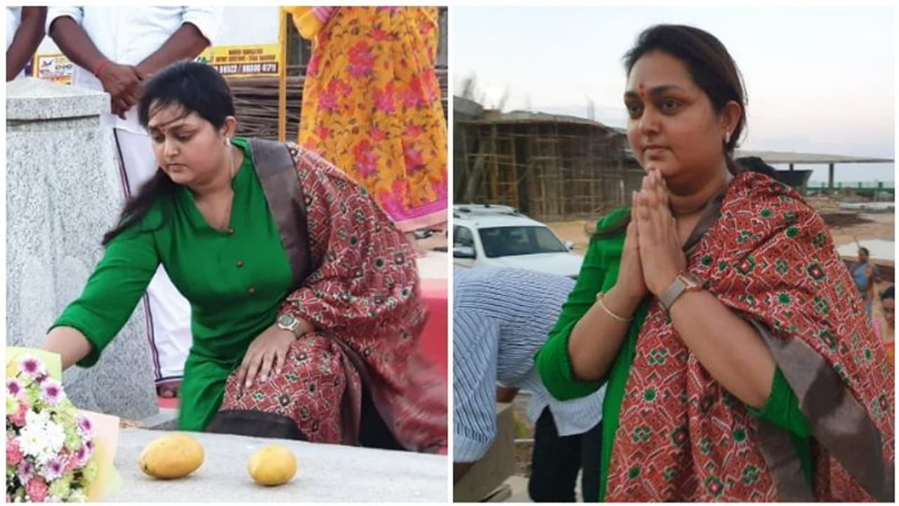 அதிமுகவின் நட்சத்திர பேச்சாளரும், நடிகையுமான விந்தியா அம்மாவின் சமாதியில் மாம்பழங்களை வைத்து மண்டியிட்டு வணங்கி சென்றார்.