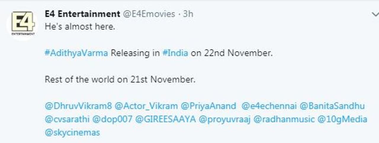 அதே வேளை, ஏற்கெனவே சொன்ன தேதியான நவம்பர் 21ம் தேதி வெளிநாடுகளில் மட்டும் ஆதித்ய வர்மா படம் ரிலீசாகும் என தயாரிப்பு தரப்பு அறிவித்துள்ளது.