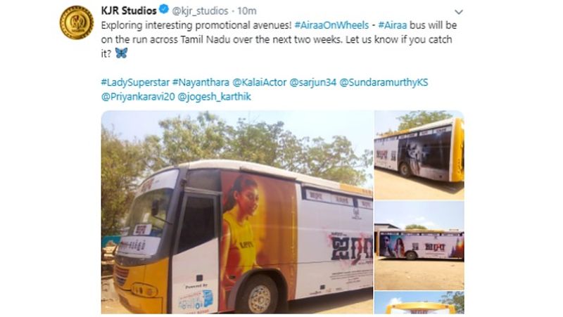 இந்தப் படம் வரும் 28ம் தேதி ரிலீஸாகவிருக்கும் நிலையில், தயாரிப்பு நிறுவனமான கே.ஜே.ஆர் ஸ்டூடியோஸ், 'ஐரா’ படத்தின் ஸ்டிக்கர்ஸ் ஒட்டிய வாகனத்தை புரொமோஷனுக்காக தமிழகம் முழுவதும் ஓட வைக்க திட்டமிட்டுள்ளனர். இதுகுறித்து அந்த நிறுவனம் இன்று (20ம் தேதி) தனது ட்விட்டர் பக்கத்தில், “ 'ஐரா’ பஸ் அடுத்த இரண்டு வாரங்களுக்கு தமிழகம் முழுவதும் ஓடும்; இந்த பஸ்ஸை பார்ப்பவர்கள் எங்களுக்கு தெரியப்படுத்துங்கள்” என்று கூறியுள்ளது.