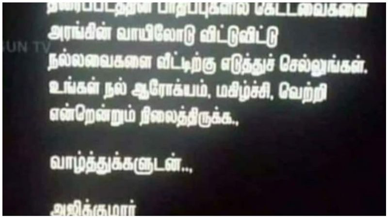 உங்கள் நல் ஆரோக்யம், மகிழ்ச்சி, வெற்றி என்றென்றும் நிலைத்திருக்க,, வாழ்த்துகளுடன்.., அஜித்குமார்’’ என்ற வாசகத்தை சேர்த்துள்ளார். அஜித். இதனை பார்த்த அவரது ரசிகர்கள், ’தல’ நம்மீது எவ்வளவு அக்கறை..? எனக் கூறி நெகிழ்ச்சியோடு தியேட்டரை விட்டு திரும்புகிறார்கள்.