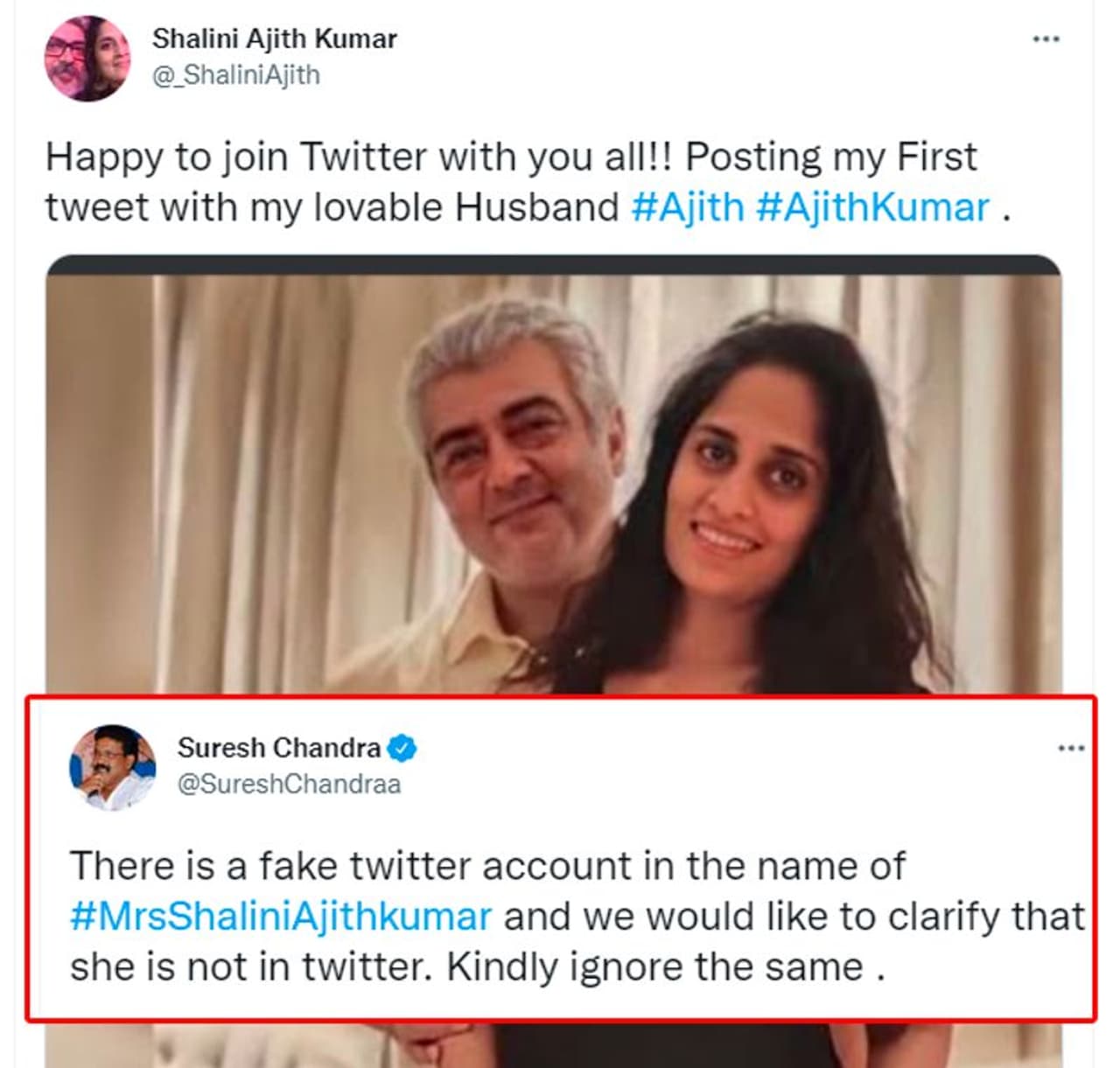 Shalini Ajith Kumar என்ற பெயர் கொண்ட அந்த டுவிட்டர் பக்கத்தில் அஜித், ஷாலினி ஜோடியாக எடுத்த புகைப்படம் ஒன்று பதிவிடப்பட்டு இருந்தது.