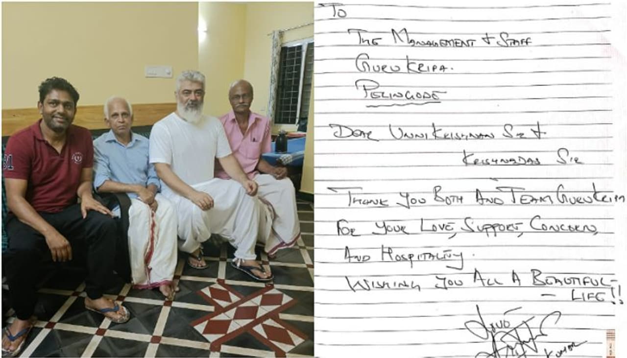 நடிகர் அஜித் சமீபத்தில் கேரளாவில் கடந்த சில தினங்களாகவே தங்கி இருந்து ஆயுர்வேத சிகிக்சை மேற்கொண்டு வருகிறார். இதையடுத்து, சமீபத்தில் அங்குள்ள கோவிலுக்கு பாரம்பரிய உடையான பட்டு வேஷ்டி அணிந்து அவர் தரிசனம் செய்தபோது எடுக்கப்பட்ட புகைப்படங்கள் வெளிவந்து இணையத்தில் வைரல் ஆனது. தற்போது, ஆயுர்வேத சிகிக்சை முடிந்துள்ள நிலையில், நடிகர் அஜித் தனது நன்றியை தெரிவிக்கும் விதமாக கடிதம் ஒன்றை எழுதியுள்ளார்.