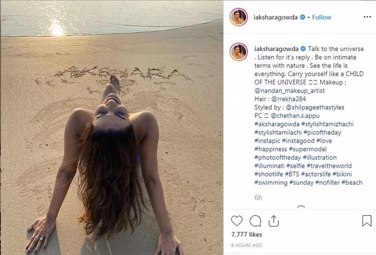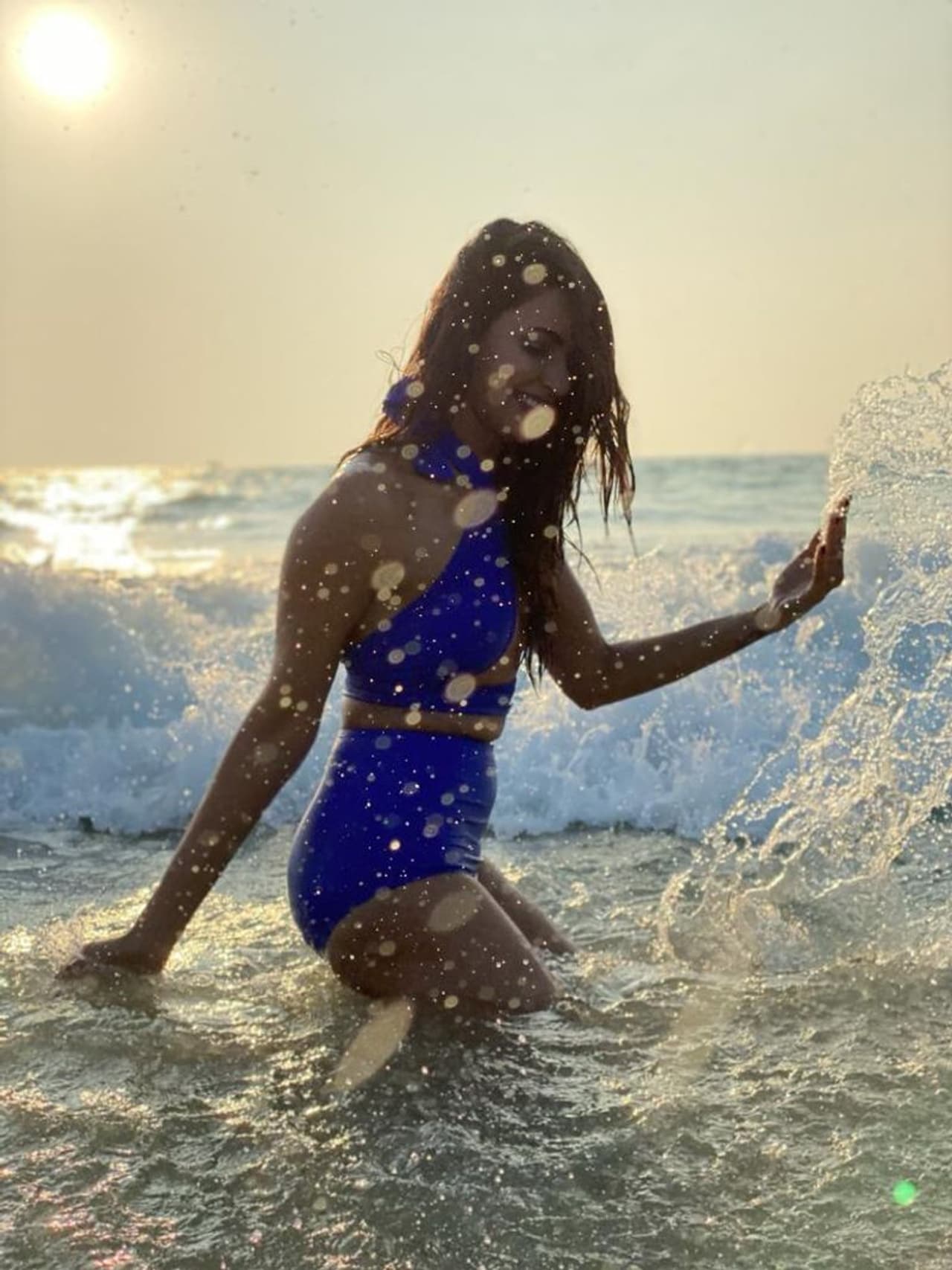 இந்த முறை கடற்கரையோரம் நீல நிற பிகினி உடையில் ஆனந்த நீராடியபடி அக்ஷரா கொடுத்திருக்கும் ஹாட் போஸ்கள், ரசிகர்களின் லைக்குகளை அள்ளி வருகிறது. இதில் ஒரு புகைப்படத்தையும் தன்னுடைய இன்ஸ்டாகிராம் பக்கத்தில் அக்ஷரா கவுடா பகிர்ந்துள்ளார்.