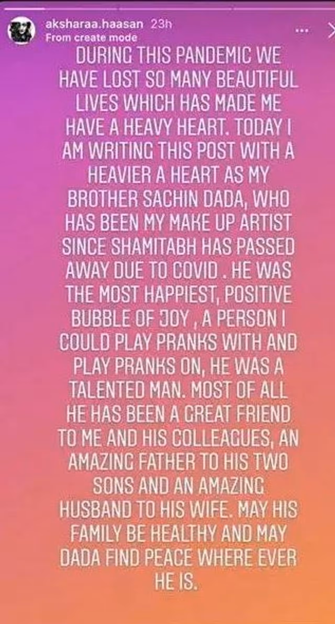 இந்நிலையில் நடிகையும், உலக நாயகன் கமல் ஹாசனின் இளைய மகளுமான அக்சராஹாசனை அப்படி ஒரு கொரோனா மரணம் உடைந்து போக வைத்துள்ளது. அக்சராவின் மேக்கப் கலைஞரான சச்சின் டாடா கொரோனா தொற்றால் உயிரிழந்துள்ளார். இதுகுறித்து தனது இன்ஸ்டாகிராம் பக்கத்தில் பதிவிட்டுள்ள அக்சரா.