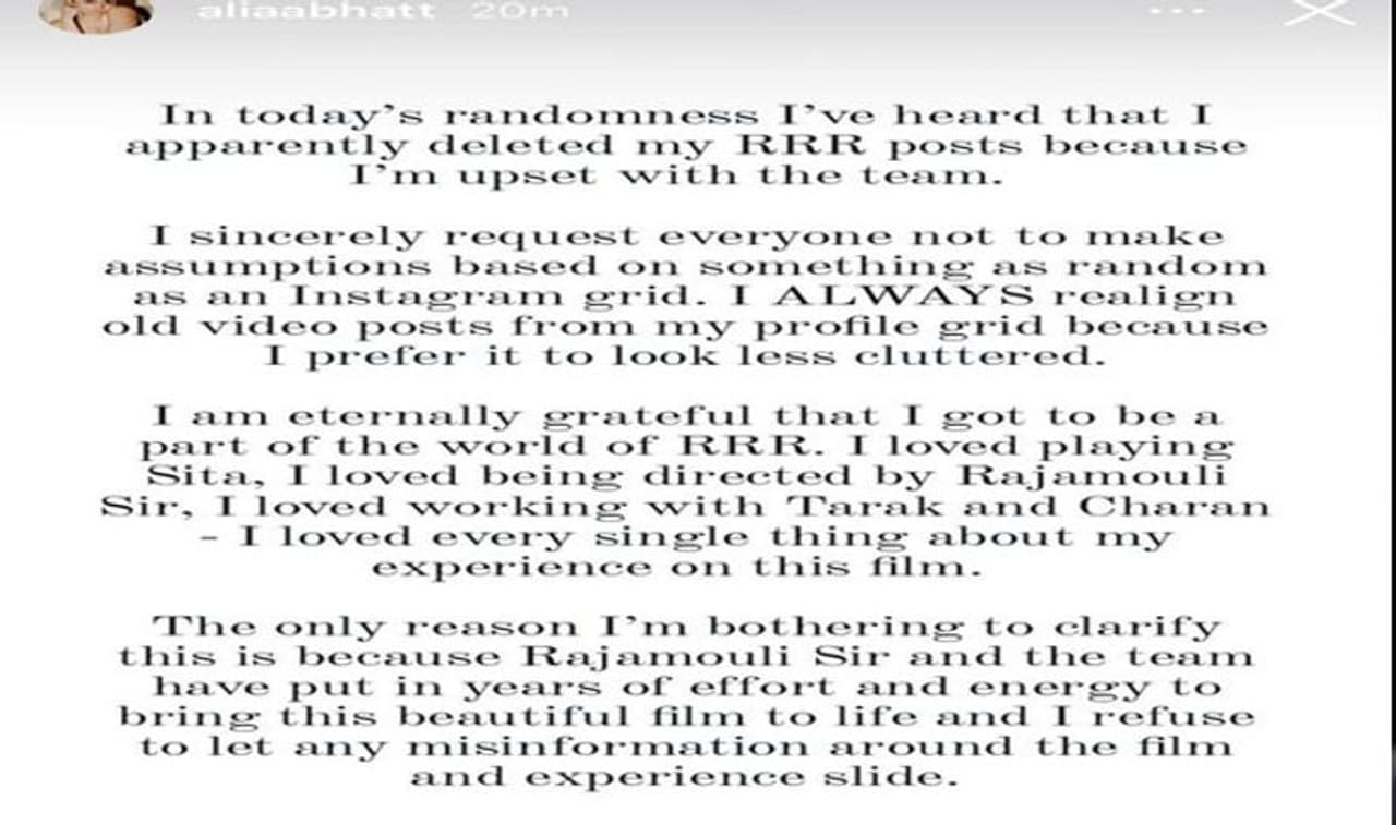 இந்த விஷயம் குறித்து நான் விளக்கம் கொடுப்பதற்கு காரணம் என்னவெனில், ராஜமவுலியும் அவரது குழுவினரும், இந்த ஒரு அழகான திரைப்படத்தை உயிர்ப்பிக்க, பல ஆண்டுகளாக கடுமையாக உழைத்துள்ளனர். அதனால் இப்படத்தைப் பற்றியும், என்னைப் பற்றியும் வரும் தவறான தகவல்கள் அனைத்தையும் நான் மறுக்கிறேன்” என பதிவிட்டுள்ளார். இதன்மூலம் ராஜமவுலி மீது கோபத்தில் இருப்பதாக பரவிய வதந்திகளுக்கு முற்றுப்புள்ளி வைத்துள்ளார் ஆலியா பட்.