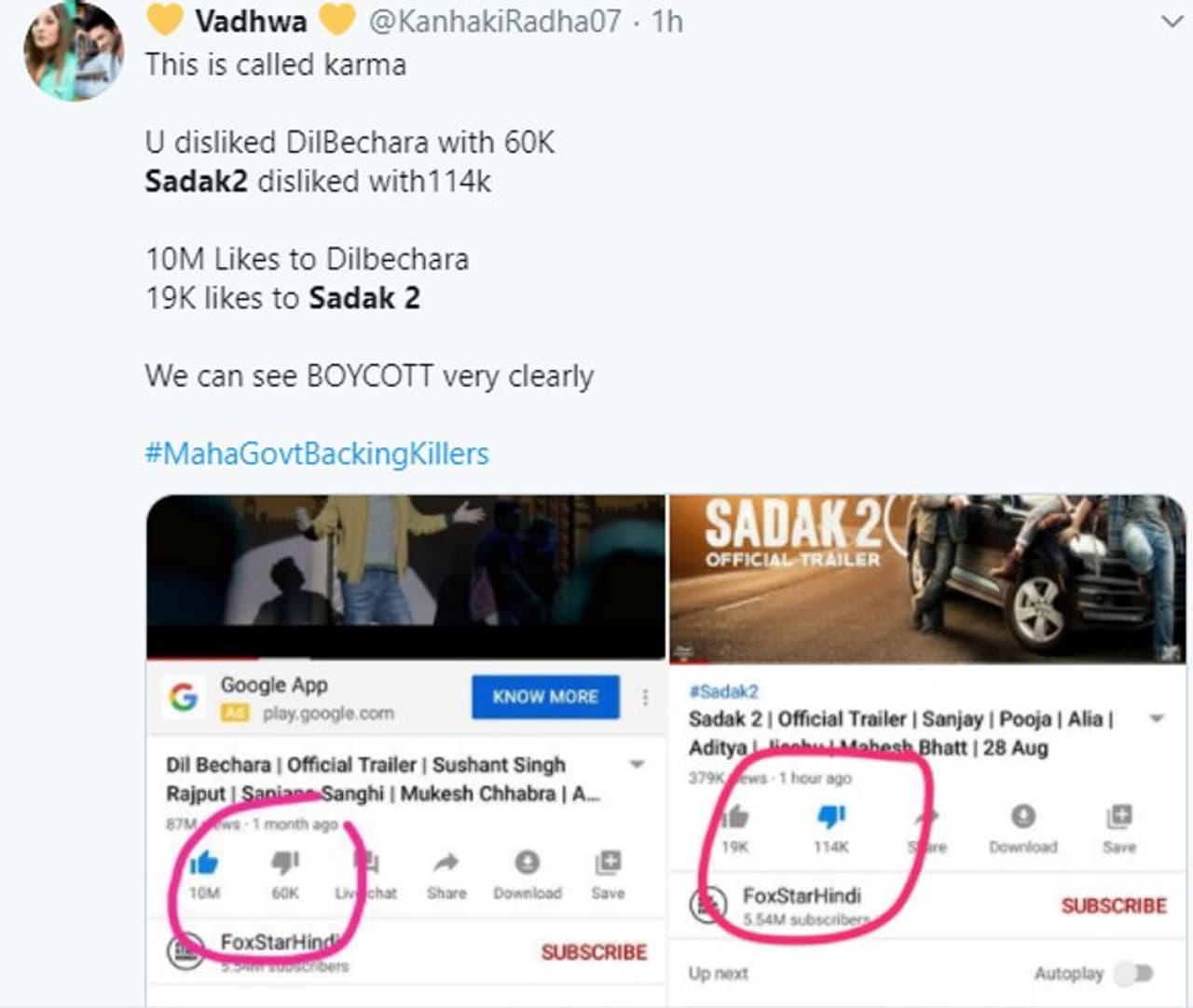 சுஷாந்தின் மரணத்திற்கு முக்கிய காரணமாக ரசிகர்கள் கருதுவது பாலிவுட்டின் முன்னணி இயக்குநர் மகேஷ் பட்டை தான், இதனால் தான் அவருடைய மகளான ஆலியா பட் மீது மொத்த கோபமும் திரும்பியுள்ளது. சத்க் 2 படத்தின் டிரெய்லரை டிஸ்லைக் செய்ய வேண்டுமென சுஷாந்த் சிங் ராஜ்புட்டின் ரசிகர்கள் கோரிக்கை வைத்திருந்தனர். அதையடுத்தே அதிக டிஸ்லைக்குகளை பெற்ற திரைப்படம் என்ற சாதனையை சதக் 2 பெற்றது குறிப்பிட்டத்தக்கது.