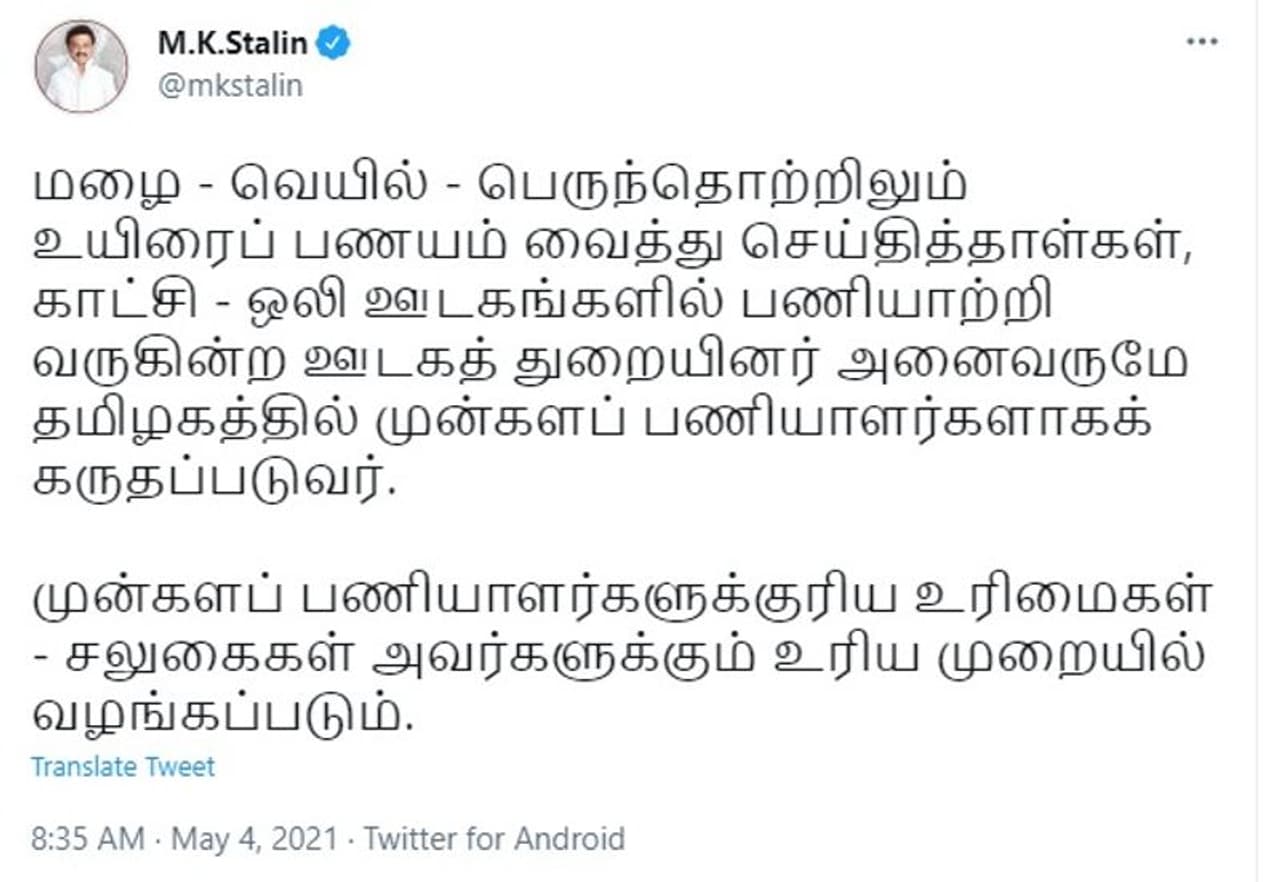 விரைவில் தமிழக முதல்வர் பதவியை ஏற்க உள்ள நிலையில்... ஸ்டாலின் தன்னுடைய ட்விட்டர் பக்கத்தில், "கடும் மழையிலும், கொளுத்தும் வெயிலிலும், பெருந்தொற்றிலும் உயிரைப் பணயம் வைத்து உழைக்கும் ஊடகத் துறையினர் முன்களப் பணியாளர்களாகத் தமிழகத்தில் கருதப்படுவார்கள். செய்தித்தாள்கள், காட்சி ஊடகங்கள், ஒலி ஊடகங்கள் போன்றவற்றில் பணியாற்றி வருகின்ற தோழர்கள் அனைவருமே இந்த வரிசையில் அடங்குவார்கள். முன்களப் பணியாளர்களுக்கான உரிமைகளும், சலுகைகளும் அவர்களுக்கு உரிய முறையில் வழங்கப்படும் என அறிவித்துள்ளார்.
