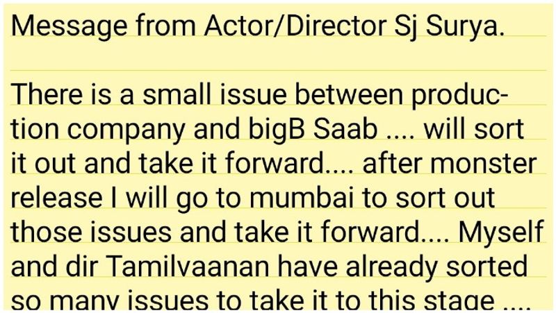 அச்செய்தி குறித்து சில நாட்கள் அமைதிகாத்த எஸ்.ஜே சூர்யா நடந்த சம்பவங்கள் எது பற்றியும் விளக்காமல் அறிக்கை ஒன்றை வெளியிட்டுள்ளார். அதில், ...அமிதாப் பச்சன் மற்றும் தயாரிப்பு நிறுவனம் இடையே ஒரு சிறிய பிரச்சனை ஏற்பட்டுள்ளது. விரைவில் அது சரிசெய்யப்பட்டு படப்பிடிப்பு மீண்டும் துவங்கும். ’மான்ஸ்டர்’ படத்தின் ரிலீசுக்கு பிறகு நான் மும்பை சென்று பிரச்சனைக்கு தீர்வு காண்பேன். நானும், இயக்குநர் தமிழ்வாணனும் இதுபோன்ற பல்வேறு பிரச்சனைகளை தாண்டி தான் இந்த இடத்திற்கு வந்துள்ளோம். படப்பிடிப்பின் மூன்றாவது நாளில் அமிதாப் சார் பதிவு செய்த ட்வீட்டில் அவரது அன்பும், எங்களது உழைப்பின் மீது அவர் வைத்திருந்த மரியாதையும் தெரிந்தது. எதிர்மறை விமர்சனங்களை தவிர்க்கவும்’ என்று பதிவிட்டிருக்கிறார்.