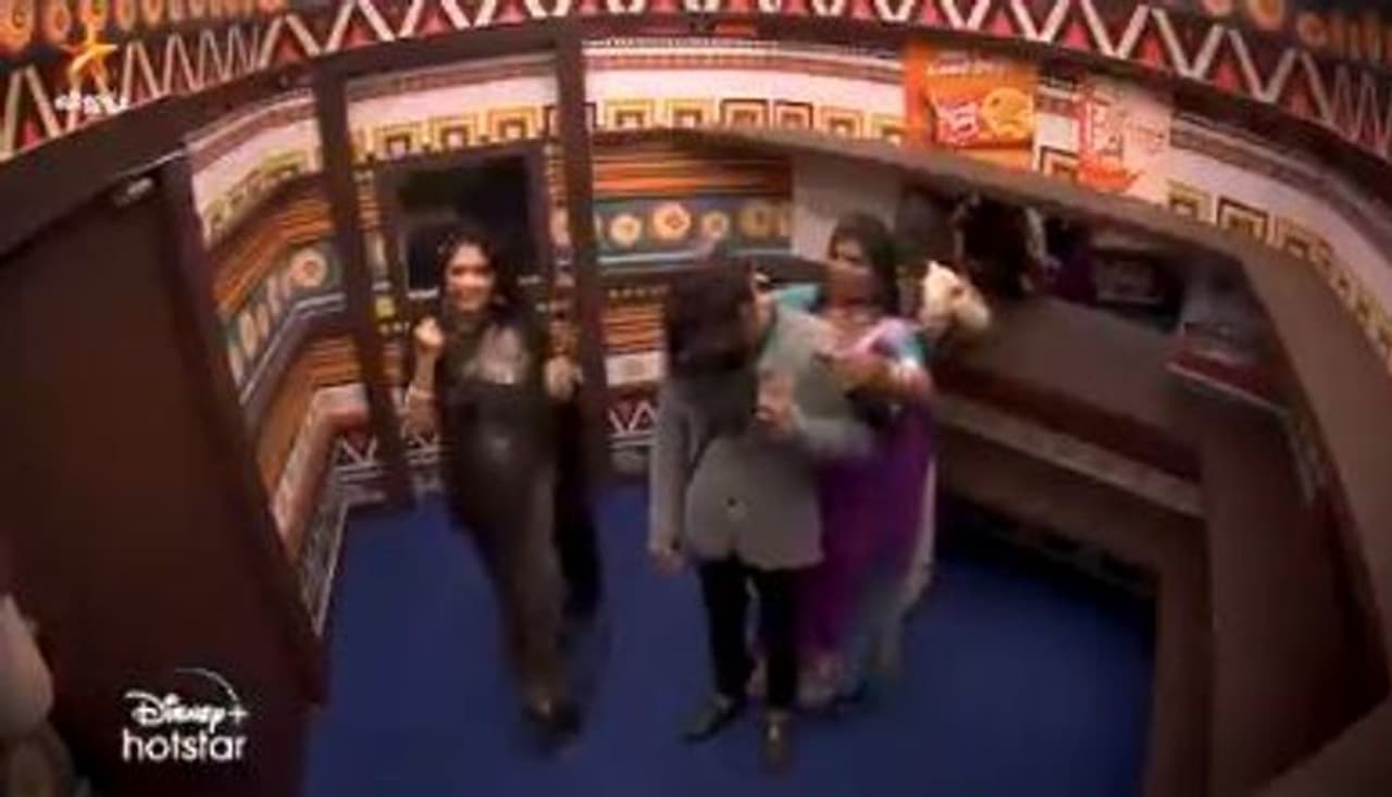 வாசல் வழியாக வராமல், போட்டியாளர்கள் அனைவரும் வெளியே அமர்ந்து பேசிக்கொண்டிருக்கும் போது, மூவரும் வருகிறார்கள். இவரைகளை பார்த்து மற்ற போட்டியாளர்கள் அதிர்ச்சியாகி வீட்டிற்குள் சென்று, மிகவும் மிஸ் செய்ததாக ஒவ்வொருவரும் கட்டி தழுவி தங்களுடைய அன்பை வெளிப்படுத்துவது தான் தற்போதைய புரோமோவில் வெளியாகியுள்ளது.