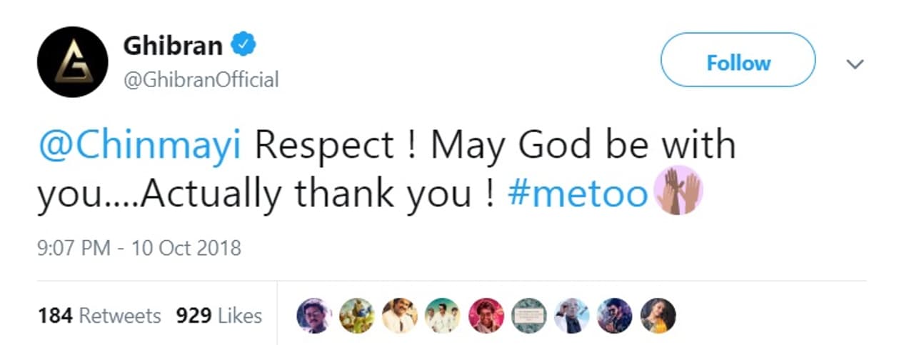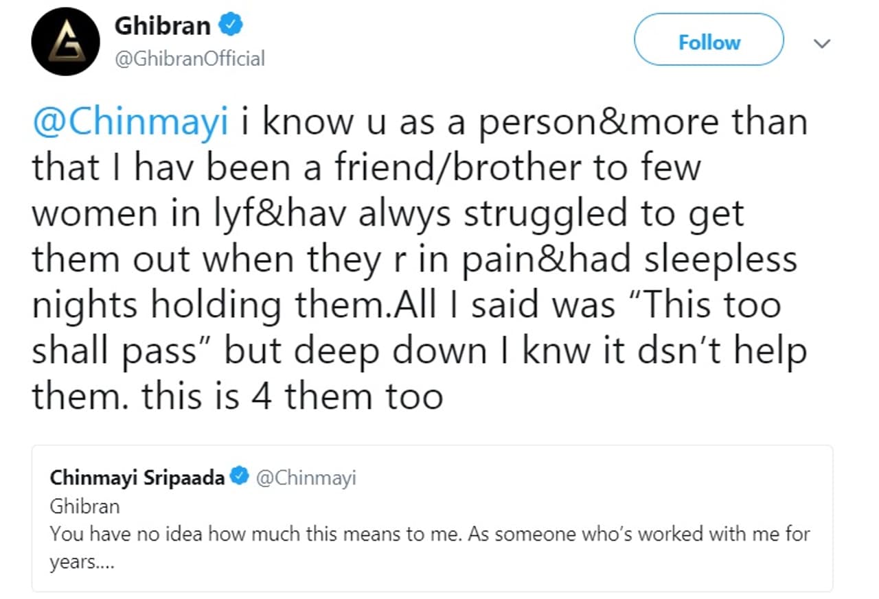 இதுகுறித்து இசையமைப்பாளர் ஜிப்ரான் வெளியிட்ட பதிவில், “சின்மயி நான் உங்களை மதிக்கிறேன். கடவுள் உங்களோடு இருப்பார். நன்றி” என்று பதிவிட்டுள்ளார். அதற்குப் பதிலளித்த சின்மயி, “ஜிப்ரான் நான் உங்களுக்குக் கடன்பட்டுள்ளேன். என்னை நம்பியதற்கு நன்றி” என்று கூறியுள்ளார்.