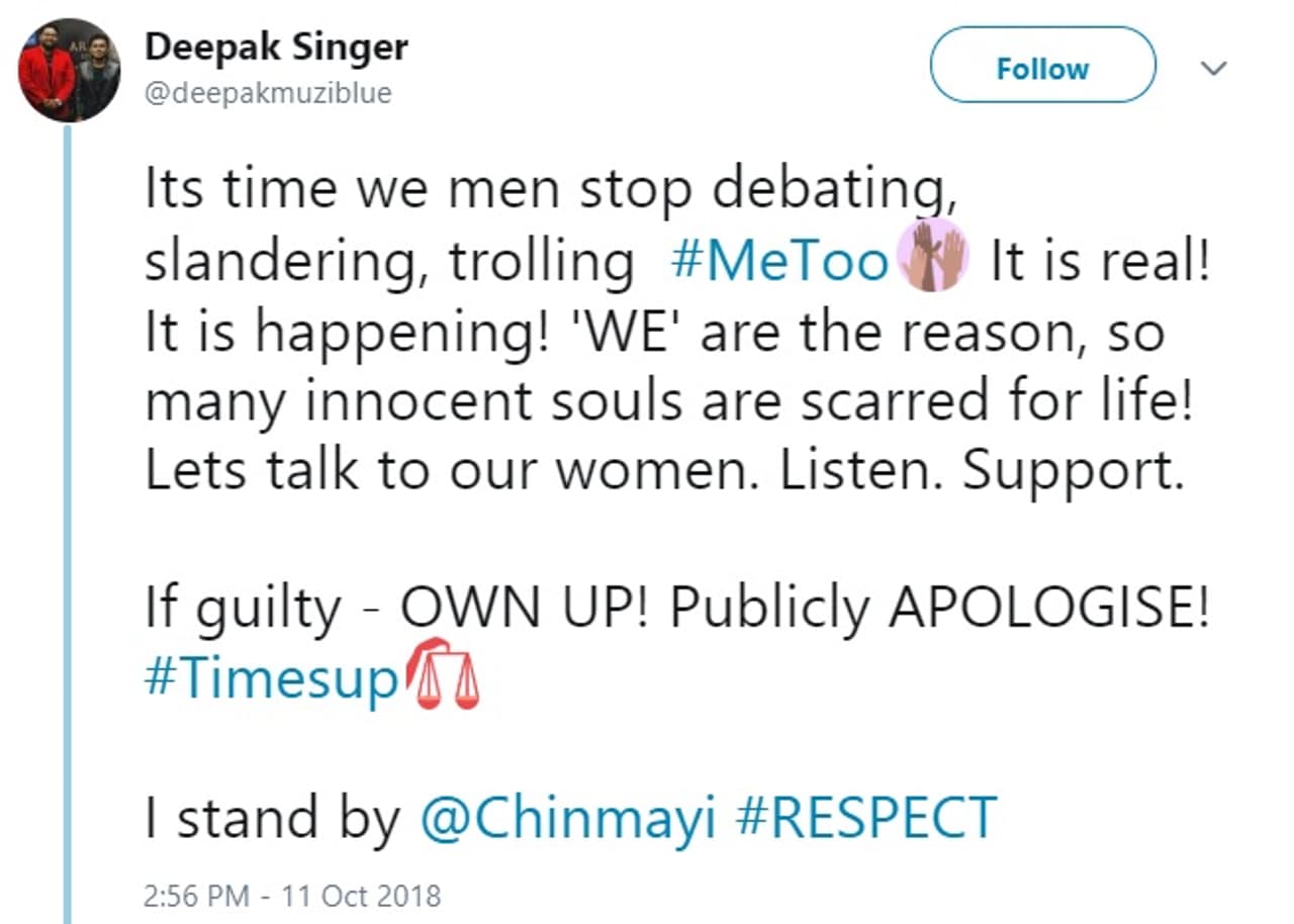சுவிட்சர்லாந்த் ஹோட்டலில் தங்கியிருந்த வைரமுத்து தம்மை தனியாக வரசொல்லியும், தமக்கு பாலியல் மிரட்டல் விடுக்கப்பட்டதாக சின்மயி கூறியிருந்த நிலையில் அவருக்கு ஆதரவாகத் திரைத் துறை, பத்திரிகைத் துறையைச் சேர்ந்த பலரும் பதிவிட்டு வருகின்றனர்.