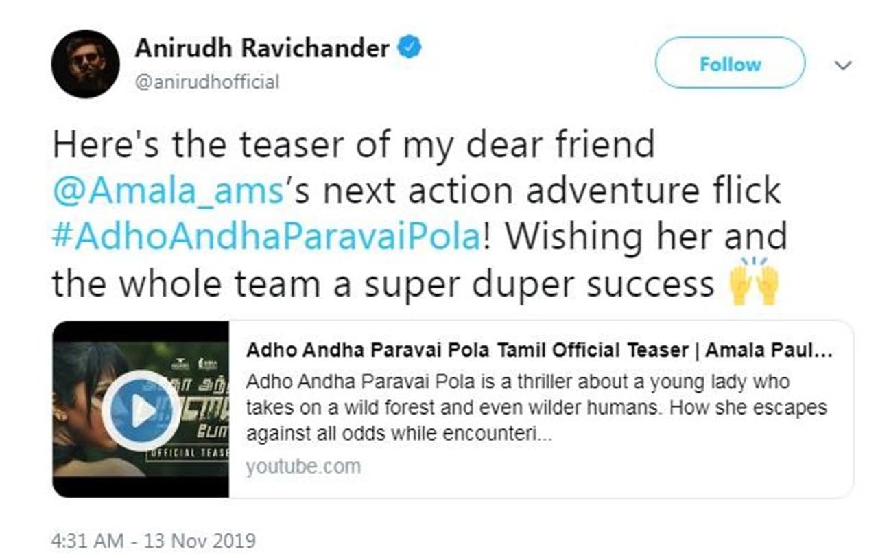 அதன்படி, 'அதோ அந்த பறவை போல' படத்தின் டீசரை தனது டுவிட்டர் பக்கத்தில் வெளியிட்டுள்ள அனிருத், தனது நண்பர் அமலாபாலுக்கும், படக்குழுவுக்கும் வாழ்த்துக்களை தெரிவித்துள்ளார்.