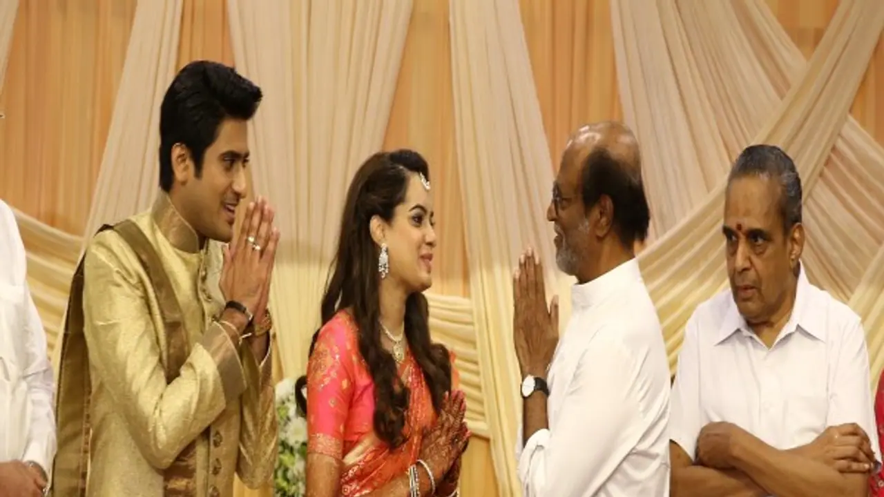 இதில் சூப்பர் ஸ்டார் ரஜினிகாந்த், ஆனந்தா பிக்சர்ஸ் எஸ்.சுரேஷ், நடிகர் சிவகுமார், சூர்யா, கார்த்தி, கவிஞர் வைரமுத்து, வைஜெயந்திமாலா பாலி, எஸ்.வி.சேகர், பிரபு, ராம்குமார், டி.சிவா, இசைஞானி இளையராஜா, ஏ.ஆர்.ரகுமான், ஆர்.பி.சௌத்ரி, மு.க.தமிழரசு, கனிமொழி எம்.பி., தயாநிதி மாறன், காவேரி கலாநிதி மாறன், எச்.ராஜா, இயக்குனர் பி.வாசு, கவுண்டமணி, சீமான், இயக்குனர் சரண், விநியோகஸ்தர் சங்க தலைவர் அருள்பதி, ரமேஷ்கண்ணா, இயக்குனர் ஹரி, விக்ரமன், தயாரிப்பாளர் முரளிதரண் வேணுகோபால், கலைஞர் மகள் செல்வி, சித்ரா லட்சுமணன், பொன்வண்ணன் சரண்யா, கே.பாக்யராஜ், கலைப்புலி எஸ்.தாணு, பூர்ணிமா பாக்யராஜ், மிஷ்கின், நடிகர் விவேக், ஜெகன், தினகரன் ஆர்.எம்.ஆர்.ரமேஷ், நடிகர் மனோபாலா, நாக் ஸ்டூடியோ கல்யாணம், சத்யம் தியேட்டர் முனி கண்ணையா, வெங்கட்ராம ரெட்டி உள்ளிட்ட பலர் நேரில் கலந்து கொண்டு மணமக்களுக்கு வாழ்த்து தெரிவித்தார்கள்.