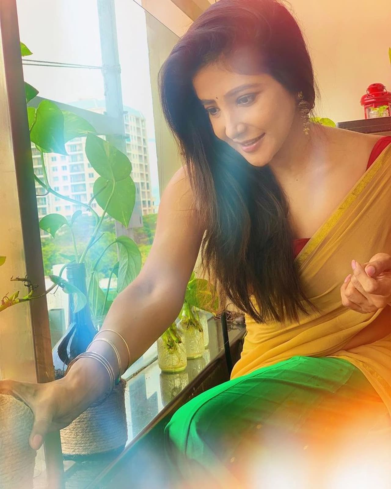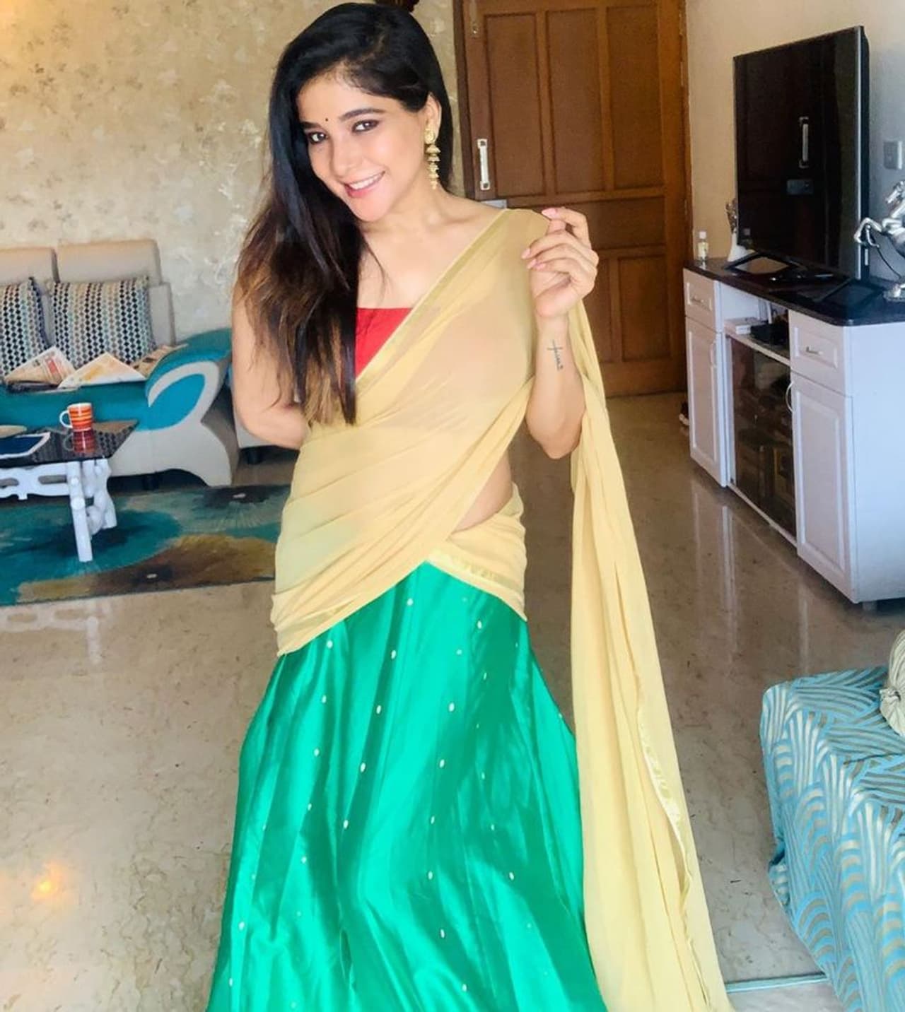 தற்போது சந்தன கலர் தாவணி, சிவப்பு கலர் ஸ்லீவ் லெஸ் பிளவுஸ், பச்சை நிற பாவாடையில் படு கிளாமராக போஸ் கொடுத்து அசத்தியுள்ளார்.
