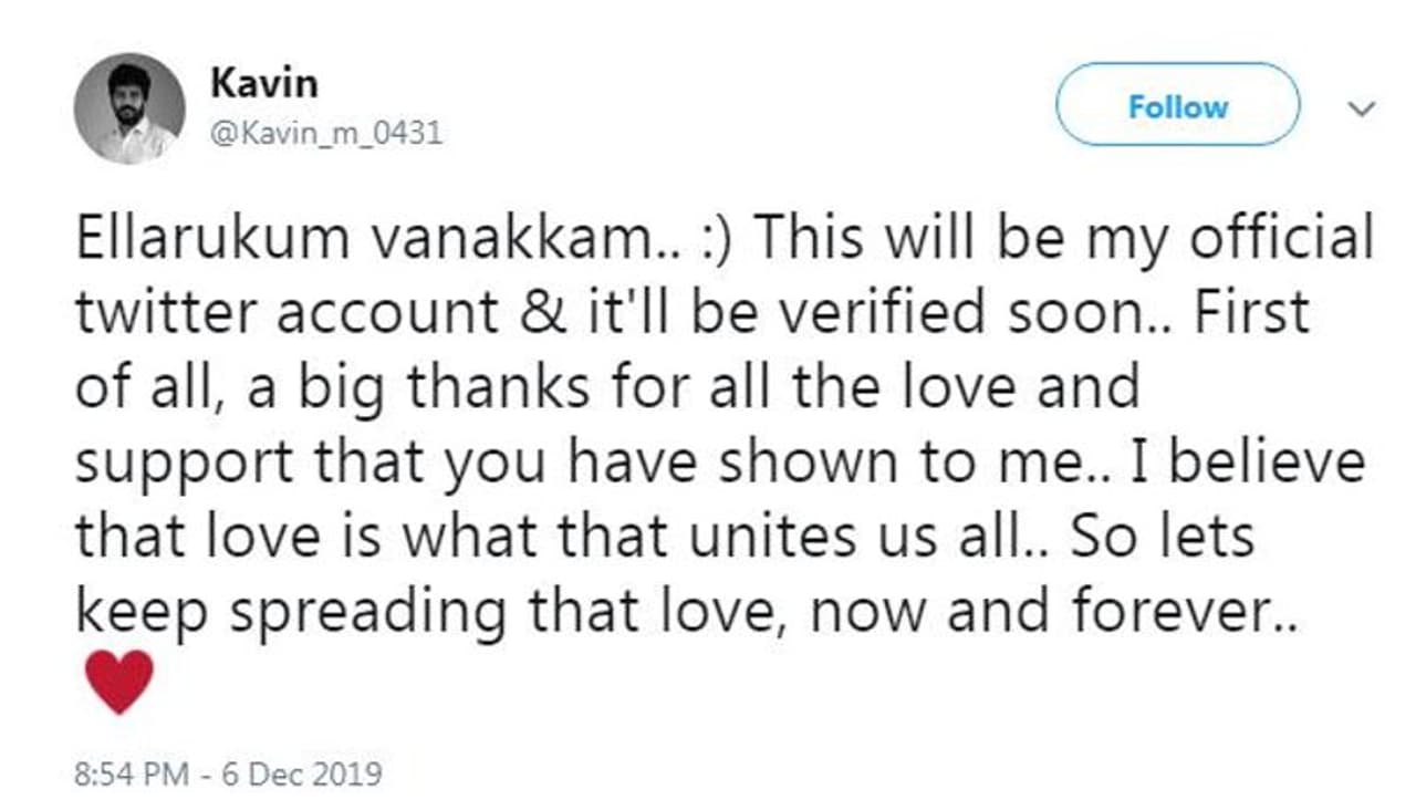 அவர்களுக்கு உற்சாகத்தை கொடுக்கும் வகையில், திடீரென இன்று (டிச.7) ட்விட்டரில் மாஸ் எண்ட்ரீ கொடுத்துள்ளார் நடிகர் கவின். தனது அக்கவுண்ட்டை கடந்த 2015ம் ஆண்டே ஆரம்பித்திருந்தாலும், தற்போதுதுான் இதனை அதிகாரப்பூர்வ ட்விட்டர் பக்கமாக அறிவித்துள்ளார்.