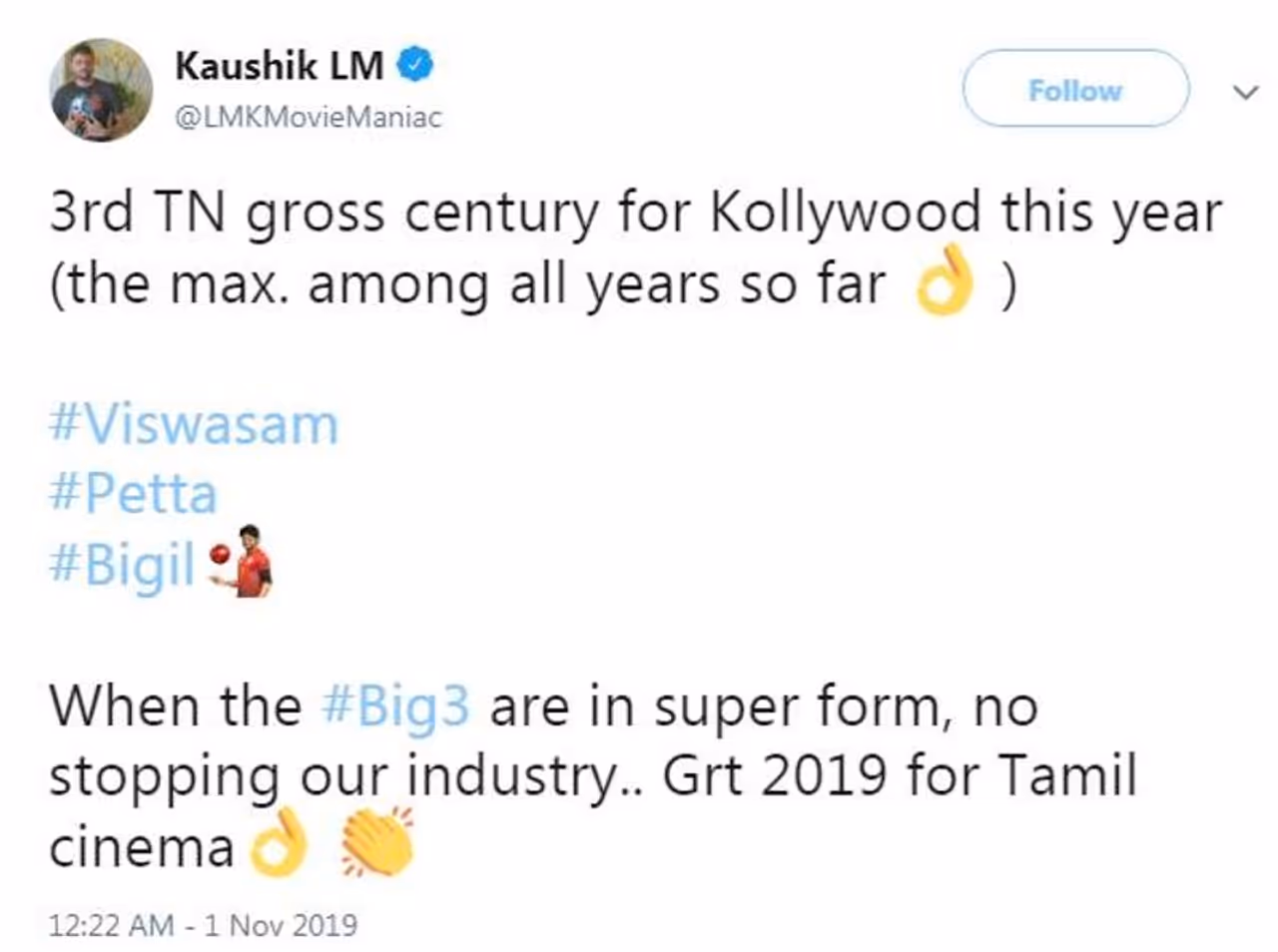 2019-ல் வெளியான தமிழ் படங்களில், தமிழகத்தில் மட்டும் ரூ.100 கோடி வசூல் செய்த 3-வது படம் 'பிகில்' என்ற பெருமையையும் பெற்றுள்ளது. பிகிலுக்கு முன்னதாக இந்த ஆண்டு வெளியான ரஜினியின் 'பேட்ட', அஜித்தின் 'விஸ்வாசம்' ஆகிய படங்கள் ரூ.100 கோடி வசூல் செய்து ஏற்கெனவே இந்த சாதனையை படைத்துள்ளன. திரையரங்குகளில் பிகில் படத்திற்கான காட்சிகள் குறைக்கப்பட்டுவிட்டதாகக் கூறப்பட்டாலும், இன்றைய சூழலில் ஒரு படம் ஒரு வாரம் கடந்தும் வெற்றிகரமாக திரையரங்குகளில் ஓடுவதே சாதனைதான். அப்படி பார்க்கையில், இன்றைய தினமும் வசூலில் பங்கம் இல்லாமல் கல்லா கட்டிவரும் பிகில் படம், இந்த ஆண்டின் மாபெரும் வெற்றிப்படம் என்பதில் எந்த மாற்றுக்கருத்தும் இல்லை.