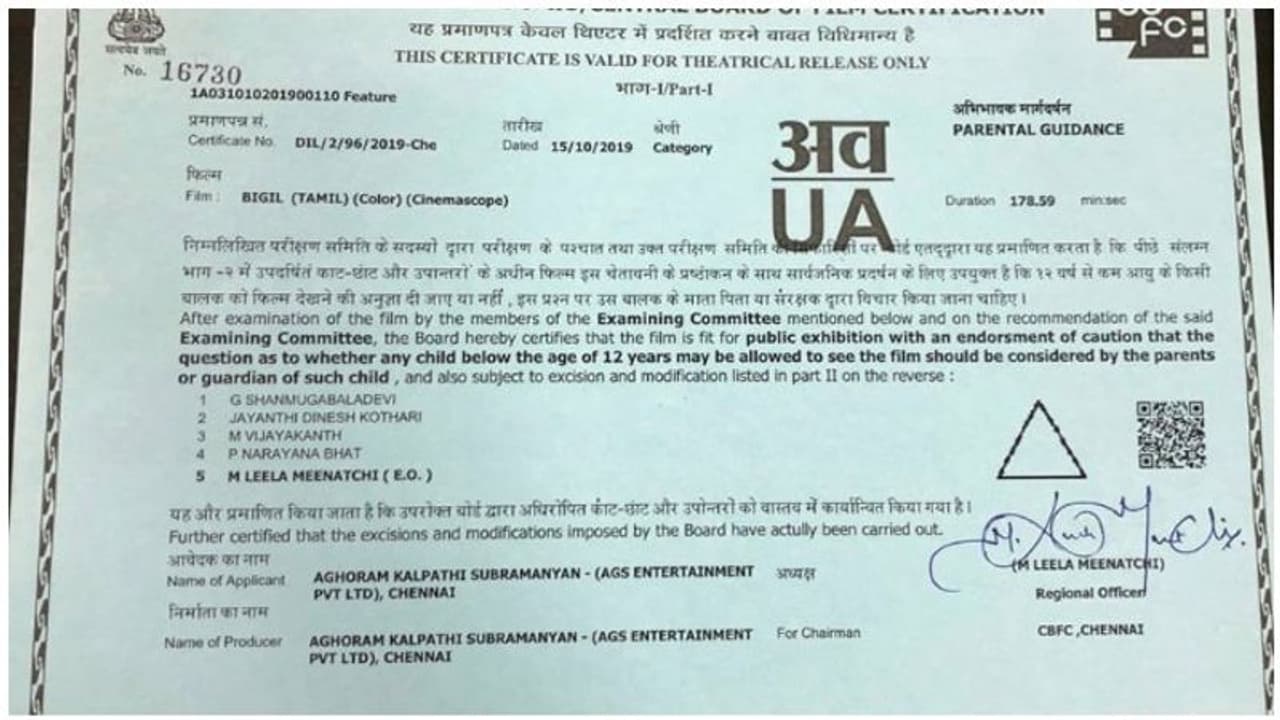 பிகில் படத்தின் சென்சாரின்போது உணர்ச்சி வசப்பட்டு சென்சார் போர்டுக்கு நன்றி என்ற வாசகத்தை நீக்கச்சொன்ன அதிகாரிகள்., ஒரு ரத்தக்களறி காட்சிகளையும் நான்கு வார்த்தைகளையும் மியூட் செய்யச்சொல்லி ‘யு/ஏ சர்டிபிகேட் வழங்கி விட்டார்கள். ஆனால் சர்டிபிகேட் கைக்கு வந்து 24 மணி நேரங்களுக்கு மேல் ஆகியும் தயாரிப்பாளர் தரப்பு அதை அதிகாரபூர்வமாக வெளியிடவில்லை.