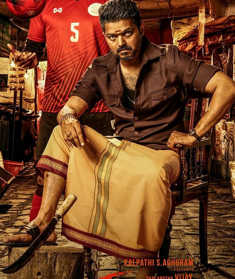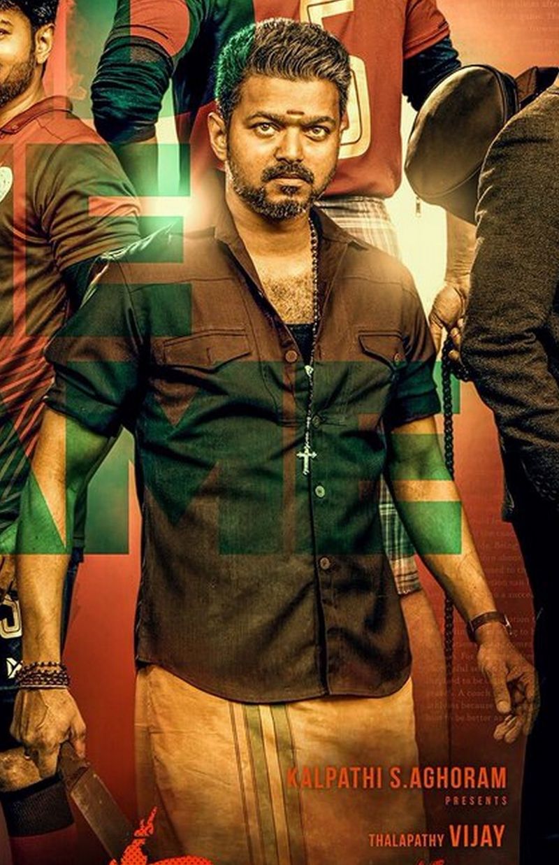 படத்தின் முதல் தோற்றத்தையும் வெளியிட்டுள்ளனர். இந்த போஸ்டரில், இரு வேடங்களில் விஜய், கால்பந்தாட்ட வீரர் உடையில் யூத் விஜய், இன்னொரு விஜய் மீன் சந்தையில், கருப்பு சட்டை - காவி வேட்டி அணிந்து நாற்காலியில் மிரட்டலான லுக்கில் கம்பீரமாக உட்கார்ந்துள்ளார். அவருக்கு முன்னால் கறி வெட்ட பயன்படுத்தும் ஒரு மரக்கட்டை, அதன் மீது கறி வெட்டும் கத்தி உள்ளது. பிகில் என தலைப்பையும், விஜய் கெட்டப்பையும் ரசிகர்கள் கொண்டாடி வருகின்றனர்.