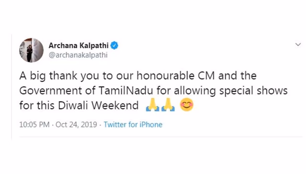 பிகில் திரைப்படத்தின் சிறப்பு காட்சிக்கு அரசு அனுமதி அளித்ததை அடுத்து பிகில் திரைப்படத்தின் தயாரிப்பு நிறுவனமான ஏஜிஎஸ் நிறுவனம் முதல்வருக்கும் தமிழக அரசுக்கும் நன்றி தெரிவித்துள்ளது