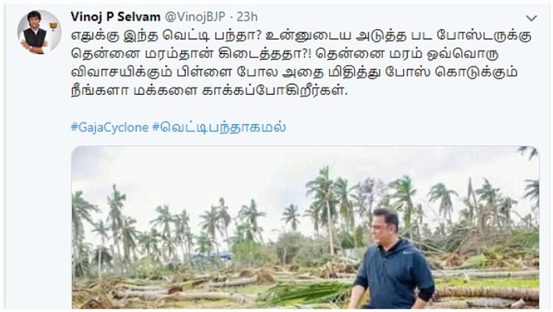 இந்நிலையில் நிவாரணப்பணிகளுக்கு மத்தியில் கமல் ஒரு தென்னை மரத்தின் மீது கால்வைத்து நின்று கொண்டிருக்கும் படத்தை வெளியிட்டு பாஜகவின் இளைஞர் அணி தலைவர் வினோத் பி.செல்வம் தனது ட்விட்டர் பக்கத்தில், “எதுக்கு இந்த வெட்டி பந்தா..? உன்னுடைய அடுத்த பட போஸ்டருக்கு தென்னை மரம்தான் கிடைத்ததா..? தென்னை மரம் ஒவ்வொரு விவசாயிக்கும் பிள்ளை போல, அதை மிதித்து போஸ் கொடுக்கும் நீங்களா மக்களை காக்கப்போகிறீர்கள்” என்று கூறியுள்ளார்.