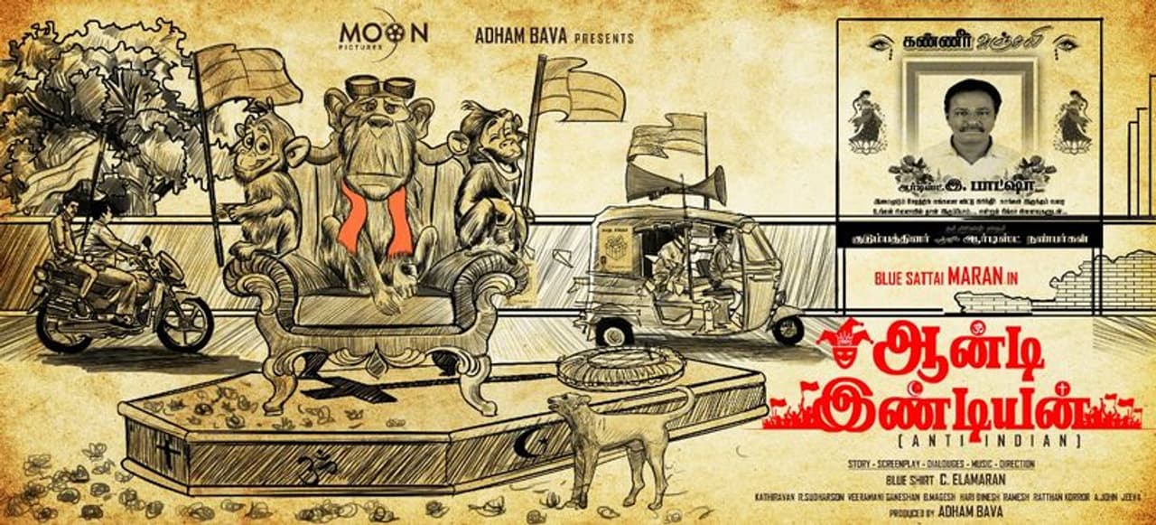 இந்நிலையில் தற்போது அவதாரம் எடுத்துள்ள, புலே சட்டை மாறனின் 'ஆன்டி இண்டியன்' படத்தின் மோஷன் போஸ்டர் தற்போது வெளியாகியுள்ளது. உண்மையில் யாரும் எதிர்பாராத அளவிற்கு போஸ்டர் வந்துள்ளது. ஒரு பிணத்தை தூக்கி வருவது போலவும், அதில் ஜாதி மத பேதம் இன்றி, இந்து, கிறிஸ்டியன், முஸ்லீம் ஆகியோர் கலந்து கொடுள்ளனர். மேலும் ப்ளூ சட்டை மாறனின் கண்ணீர் அஞ்சலி ஒட்டப்பட்ட போஸ்டர்களும் காட்டப்படுகிறது. சவப்பெட்டியில் , எம்மதமும் சம்மதம் என்பது போல், 3 மதத்தை குறிக்கும் சின்னங்களும் உள்ளது . அதே நேரத்தில் சர்ச்சைக்கு பஞ்சம் இல்லாமல், சவப்பெட்டி மேல்... காவி துண்டு போட்ட குரங்கு நடுவிலும், அதன் அருகே இரண்டு கொடி பிடித்த குரங்குகளும் உள்ளது.