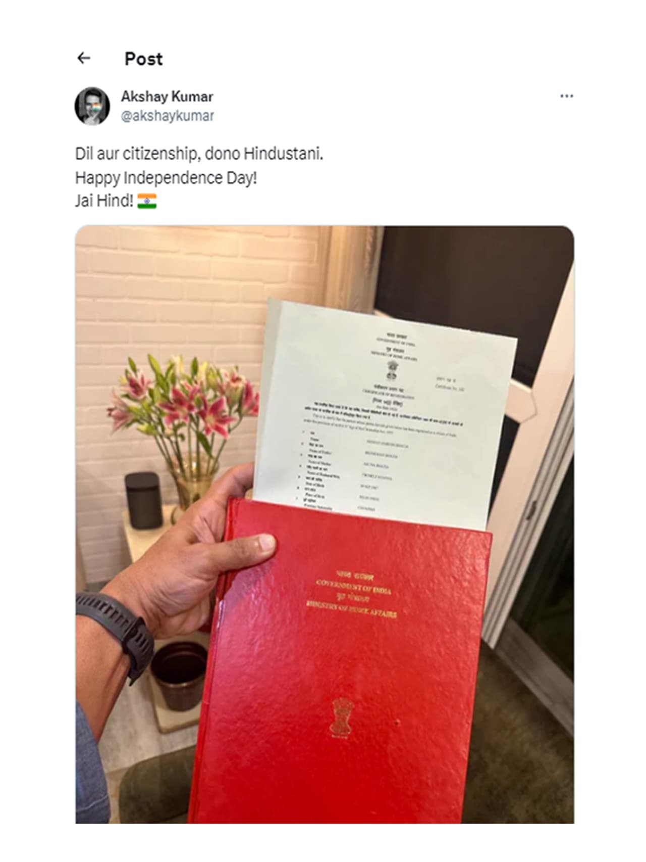 இந்த தகவலை மிகவும் மகிழ்ச்சியுடன் அக்ஷய் குமார், இந்தியாவின் 77-ஆவது சுதந்திர தினமான, இன்று வெளிப்படுத்தியுள்ளார். இதுகுறித்த அவரே தன்னுடைய ட்விட்டர் பக்கத்திலும் அறிவித்துள்ளார். அக்ஷய் குமார் தனது கனடிய குடியுரிமையைத் துறந்து, சில மாதங்களுக்கு முன்பு இந்திய பாஸ்போர்ட்டுக்கு விண்ணப்பித்திருந்த நிலையில், தற்போது இந்திய பாஸ்போட்டை அவர் பெற்றுள்ளார். ஒரு இந்தியன் என, இந்திய குடியுரிமையோடு கூறுவது மிகவும் மகிழ்ச்சியாக உள்ளது என தெரிவித்துள்ளார்.