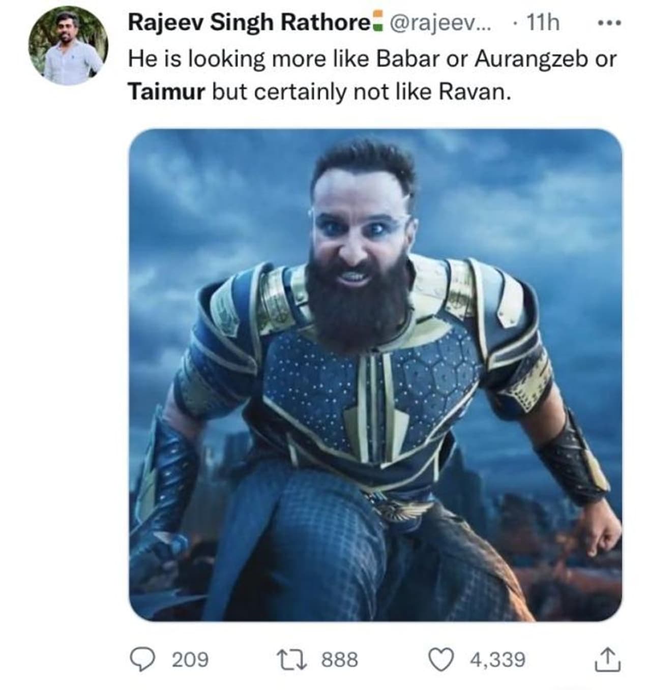 ஆனால் இந்த படத்தில் ராமர் கதாபாத்திரத்திற்கு பிரபாஸ் மிகவும் பொருத்தமாக இருப்பதாகவும், ஆனால் இந்த படத்தில், ராவணனாக நடித்துள்ள சைஃப் அலிகானின் தோற்றத்திற்கு கடும் விமர்சனங்கள் எழுந்தது. நெட்டிசன்கள் பலர், சைஃப் அலிகான் பார்ப்பதற்கு பாபர் போலவும், அவுரங்கசீப் போலவும் அவரது மகன் தைமூர் போலவும் தான் காட்சியளிக்கிறாரே தவிர, ராவணன் போல் சுத்தமாக இல்லை என கூறி வருகிறார்கள். இவர் ராவணன் கதாபாத்திரத்துக்கு பொருத்தமாக இல்லை என்பது போன்ற கருத்துக்களும் அதிகம் பகிரப்பட்டு வருகிறது. எனினும் ஒரு சில காட்சிகள் மட்டுமே டீசரில் இடம்பெற்றுள்ளதால், படம் வெளியான பிறகே... இவர் இந்த கதாபாத்திரத்திற்கு பொருத்தமாக உள்ளாரா? இல்லையா? என்பதை தெரிந்து கொள்ள முடியும்.