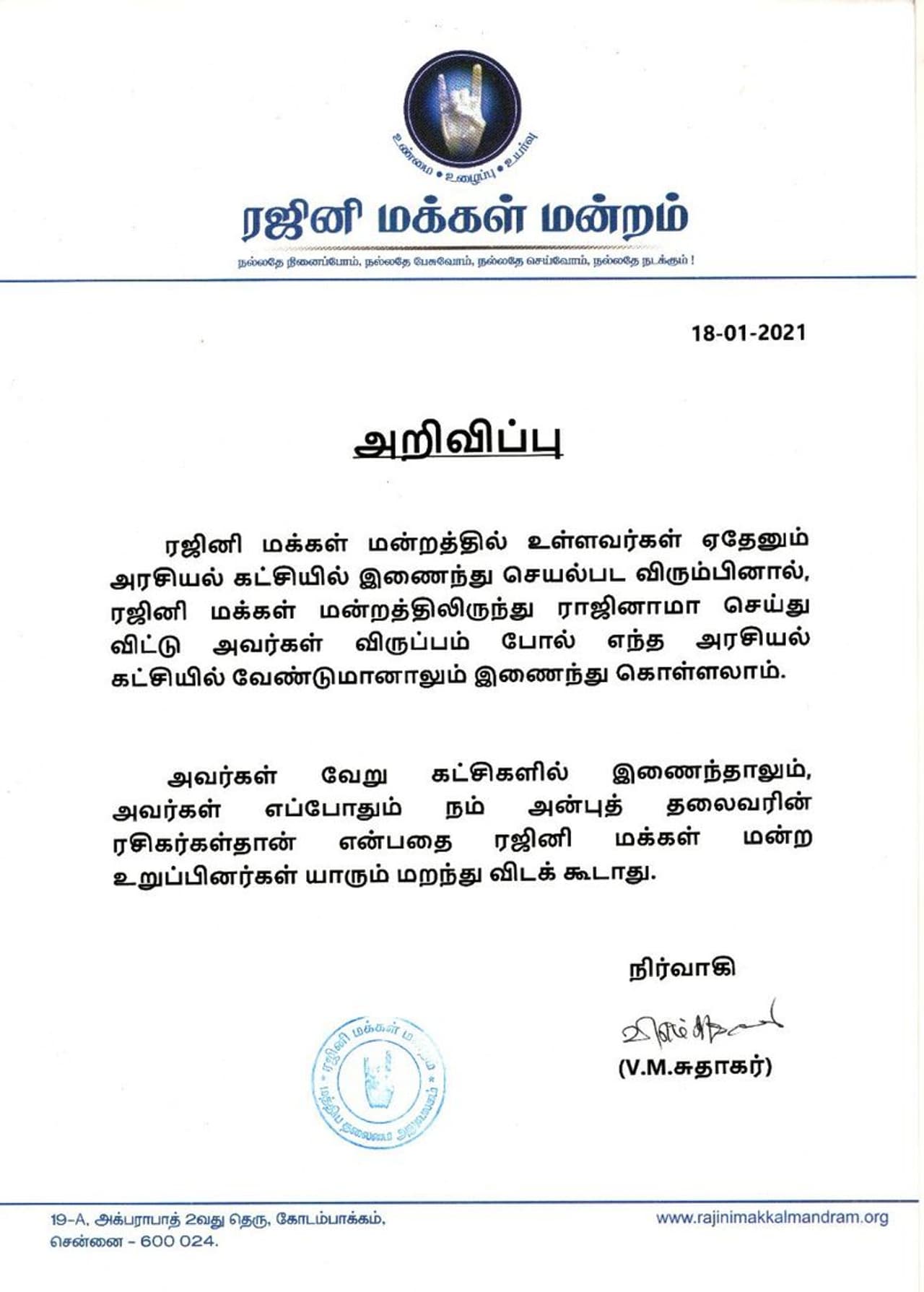 அவர்கள் வேறு எந்த கட்சியில் இணைந்தாலும், அவர்கள் எப்போதும் நம் அன்பு தலைவரின் ரசிகர்கள் தான் என்பதை ரஜினி மக்கள் மன்ற உறுப்பினர்கள் யாரும் மறந்து விட கூடாது என தெரிவிக்கப்பட்டுள்ளது".
