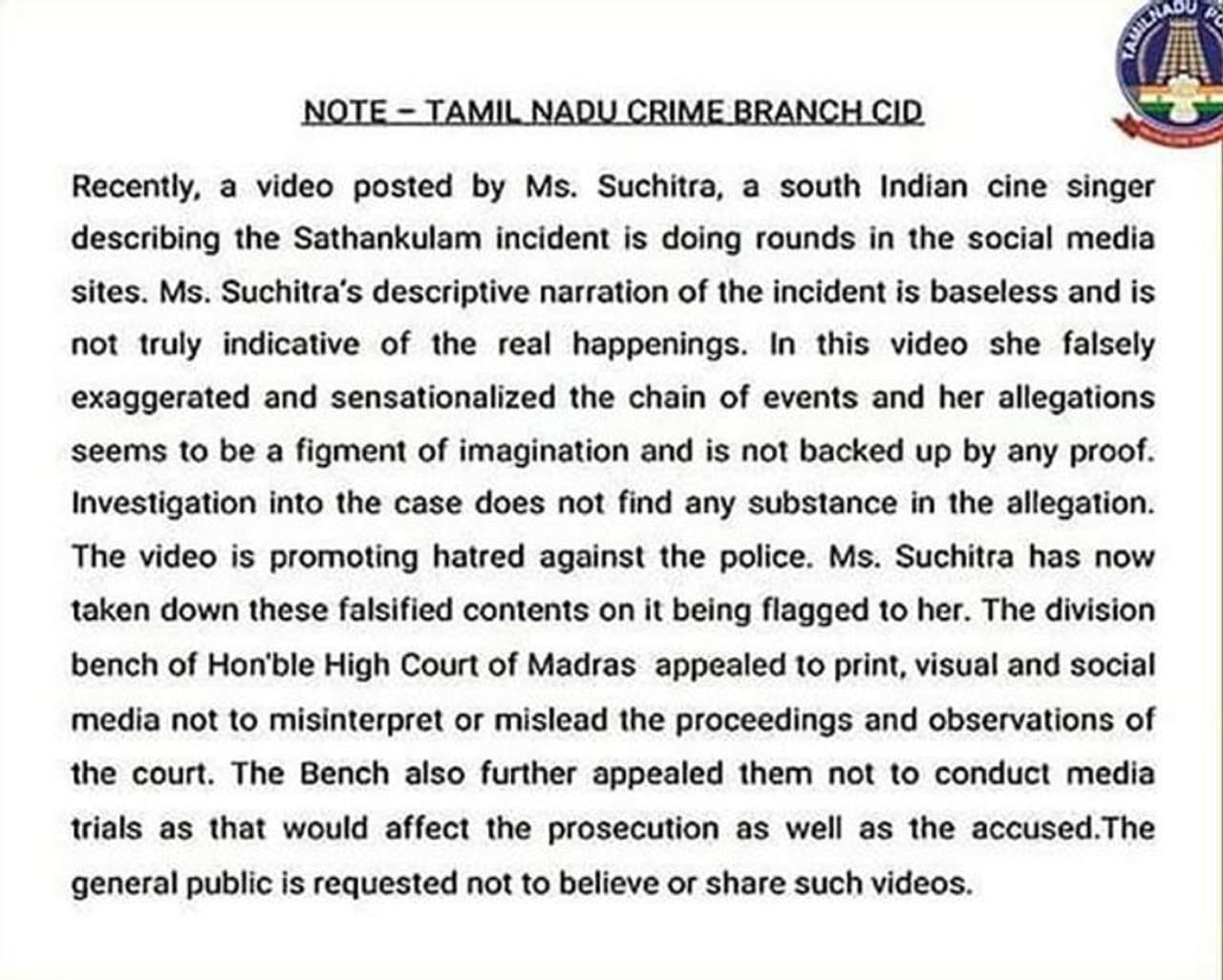 இந்த நிலையில் வழக்கை ஏற்று நடத்தி வந்த சிபிசிஐடி போலீசார் முக்கிய அறிக்கை ஒன்றை தற்போது வெளியிட்டுள்ளனர். அதில் பாடகி சுசித்ரா வீடியோவில் இருக்கும் தகவல்கள் உண்மைக்குப் புறம்பானவை என்றும் இது போலீசாருக்கு எதிராக தூண்டி விடுவதை போல் இருக்கிறது என்றும் இதனை யாரும் பகிர வேண்டாம் என கூறியிருந்தது.