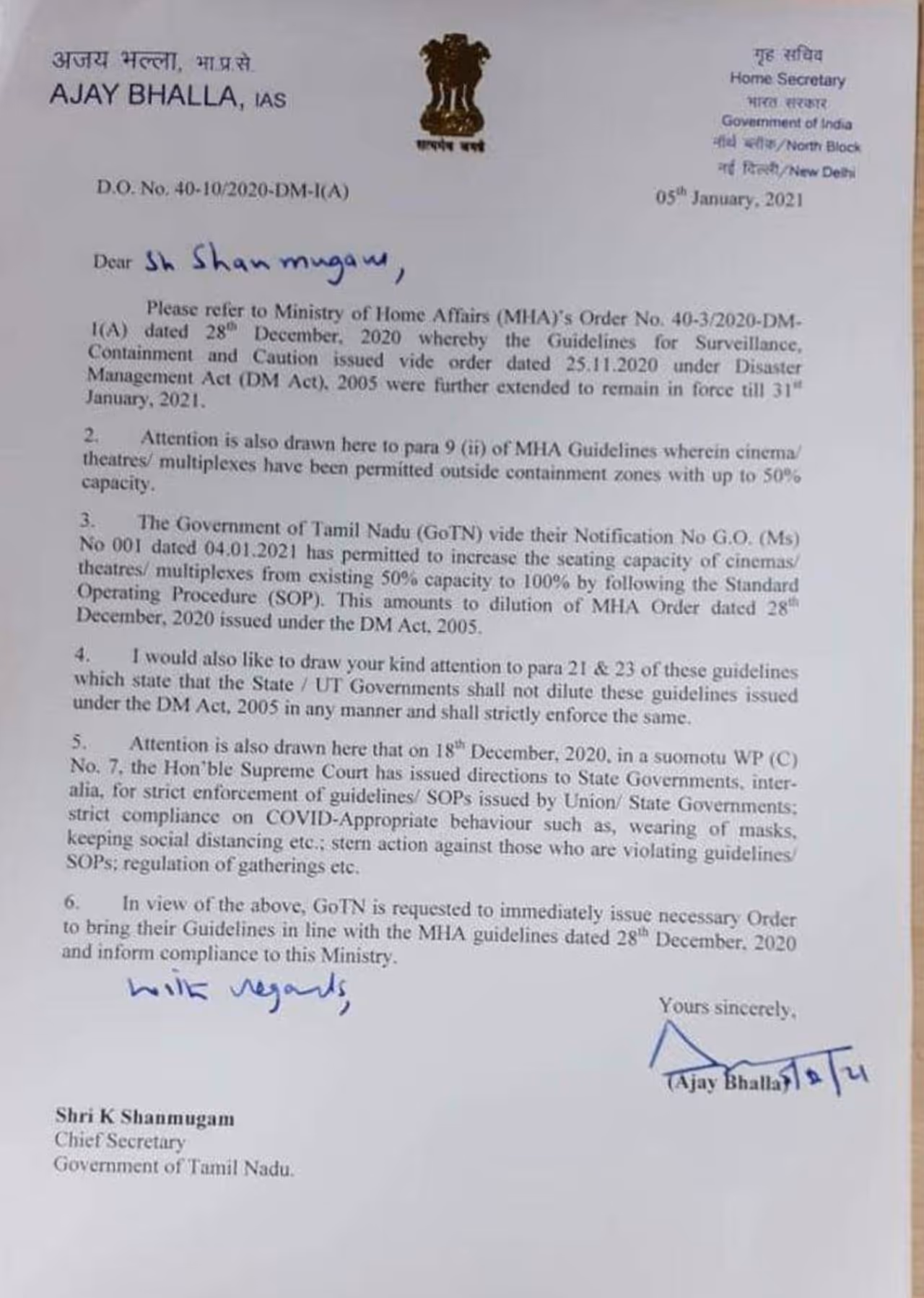 இந்நிலையில் நேற்று கொரோனா தடுப்பு நடைமுறைகளை பின்பற்ற வலியுறுத்தி மத்திய உள்துறை செயலாளர் அஜய் பல்லா, தமிழக அரசுக்கு கடிதம் ஒன்றை எழுதியிருந்தார். மேலும் தமிழகத்தில் தியேட்டர்களுக்கு 100 சதவீத இருக்கைக்கு அனுமதி அளிக்கப்பட்டுள்ளதை திரும்ப பெற வேண்டும் என்றும் அதில் வலியுறுத்தப்பட்டிருந்தது.