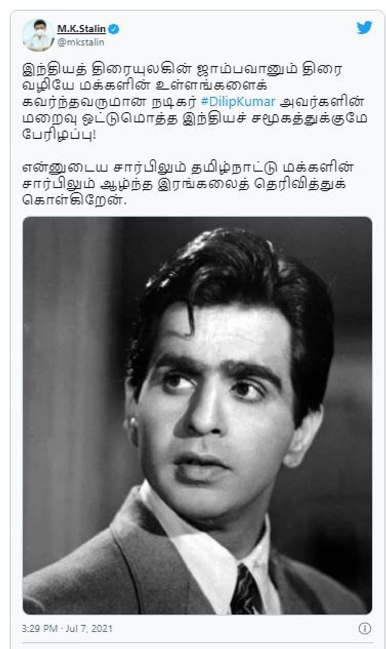பழம்பெரும் நடிகர் திலீப் குமார் மறைவு, ஒட்டு மொத்த பாலிவுட் திரையுலகையே அதிர்ச்சியாக்கிய நிலையில், இவரது மறைவுக்கு தமிழக முதலமைச்சர் ஸ்டாலின் தன்னுடைய இரங்கலை ட்விட்டர் பக்கத்தில் தெரிவித்துள்ளார்.