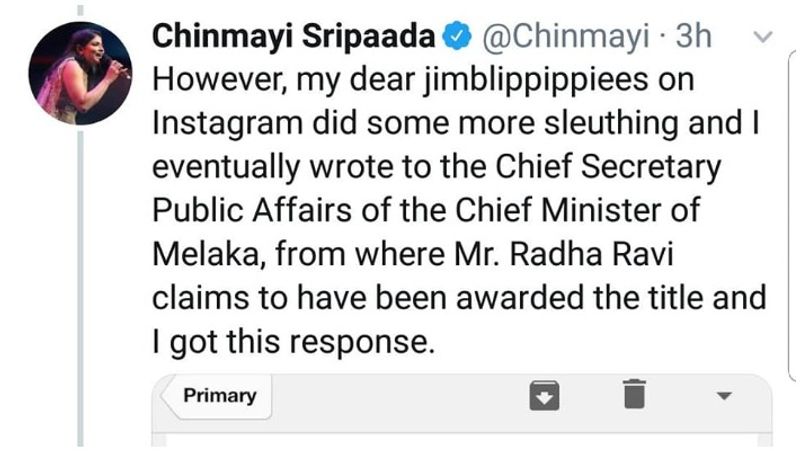 சின்மயி ராதாரவி பஞ்சாயத்துகளை தொடர்ந்து எழுதுவதற்கு சலிப்பாக இருக்கிறது. ரெண்டு பேருமே கொஞ்சம் ரெஸ்ட் எடுங்க சாமிகளா என்று யாரை நாட்டாமையாகப் போட்டு தீர்ப்பு சொல்வது என்று குழம்பிவரும் வேளையில், சில வருடங்களாக ராதாரவி தன் பெயருக்கு முன்னால் போட்டுவரும் டத்தோ என்கிற பட்டமே ஒரு சரியான டுபாக்கூர் சமாச்சாரம் என்று சந்தி சிரிக்கவைக்கிறார் சின்மயி.