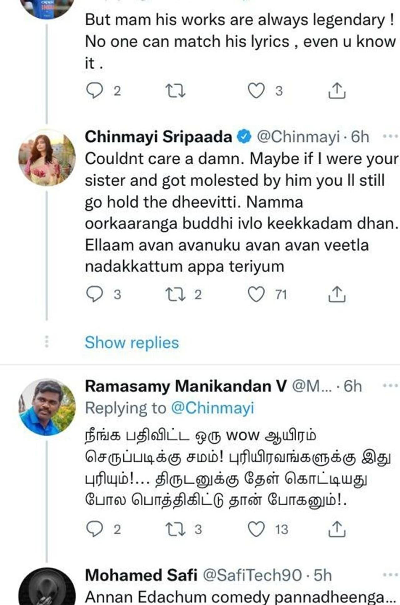 இது தொடர்பாக ட்வீட் செய்துள்ள சின்மயி; கொஞ்சமும் கவலைப்ப என கடுமையாக விமர்சனம் செய்துள்ளார்..ட முடியவில்லை. ஒருவேளை நான் உன் சகோதரியாக இருந்து அவனால் துன்புறுத்தப்பட்டாலும் நீ இன்னும் தீவிட்டியைப் பிடித்துக் கொண்டு செல்வாய். நம்ம ஊர்காரங்க புத்தி இவ்ளோ கேட்கலாம் தான். எல்லாம் அவன் அவனுக்கு அவன் வீட்டில் நடக்கட்டும் அப்பா தெரியும். வ்வாறு கடுமையாக விமர்சித்துள்ளார் சின்மயி..