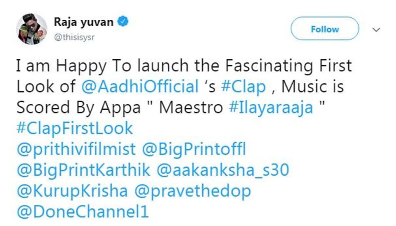 வித்தியாசமான கதைக் களத்துடன் மிகவேகமாக தயாராகிவரும் 'கிளாப்' படத்தின் ஃபர்ஸ்ட் லுக் போஸ்டரை, இசையமைப்பாளர் யுவன்சங்கர்ராஜா இன்று வெளியிட்டுள்ளார்.