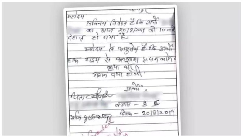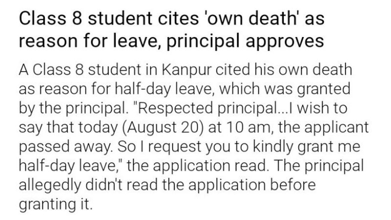 உத்தர பிரதேசம் மாநிலத்தின் கான்பூரில் 8-ம் வகுப்பு பயிலும் ஒரு மாணவன் அரைநாள் விடுப்பு தருமாறு தலைமை ஆசிரியரிடம் அனுமதி கேட்டுள்ளான். இதற்காக விடுப்புக் கடிதம் எழுதியுள்ளான் அந்த மாணவன். அதில், ‘நான் இன்று காலை 10 மணியளவில் இறந்துவிட்டதால் சீக்கிரமாக வீட்டிற்கு செல்ல வேண்டும் என்றும் தனக்கு அரைநாள் விடுமுறை வேண்டும் ’ எனவும் எழுதியிருந்தான். தன் பாட்டி இறந்து விட்டதாக எழுதுவதற்கு பதில் அவ்வாறு எழுதியுள்ளான்.