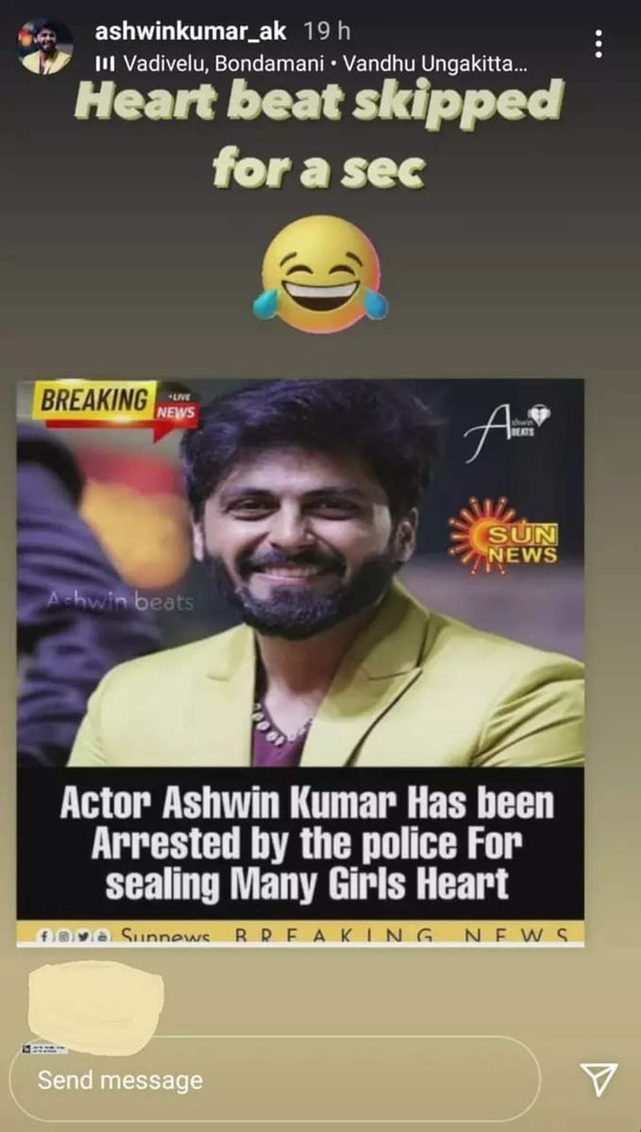 சோசியல் மீடியாவில் ஆக்டிவாக வலம் வரும் அஸ்வின் தன்னுடைய இன்ஸ்டா ஸ்டோரியில் வைத்துள்ள போஸ்டர் ஒன்று ரசிகர்களை திடுக்கிட வைத்துள்ளது. பிரேக்கிங் நியூஸ்- பல பெண்களின் மனதை திருடியதற்காக நடிகர் அஸ்வின் குமார் கைது என்று கிண்டலாக வெளியான போஸ்டரை பார்த்த அஸ்வினுக்கு ஒரு நிமிடம் பகீர் என்று ஆகிவிட்டது என பதிவிட்டு, ரசிகர்களை மிரள வைத்திருக்கிறார்.