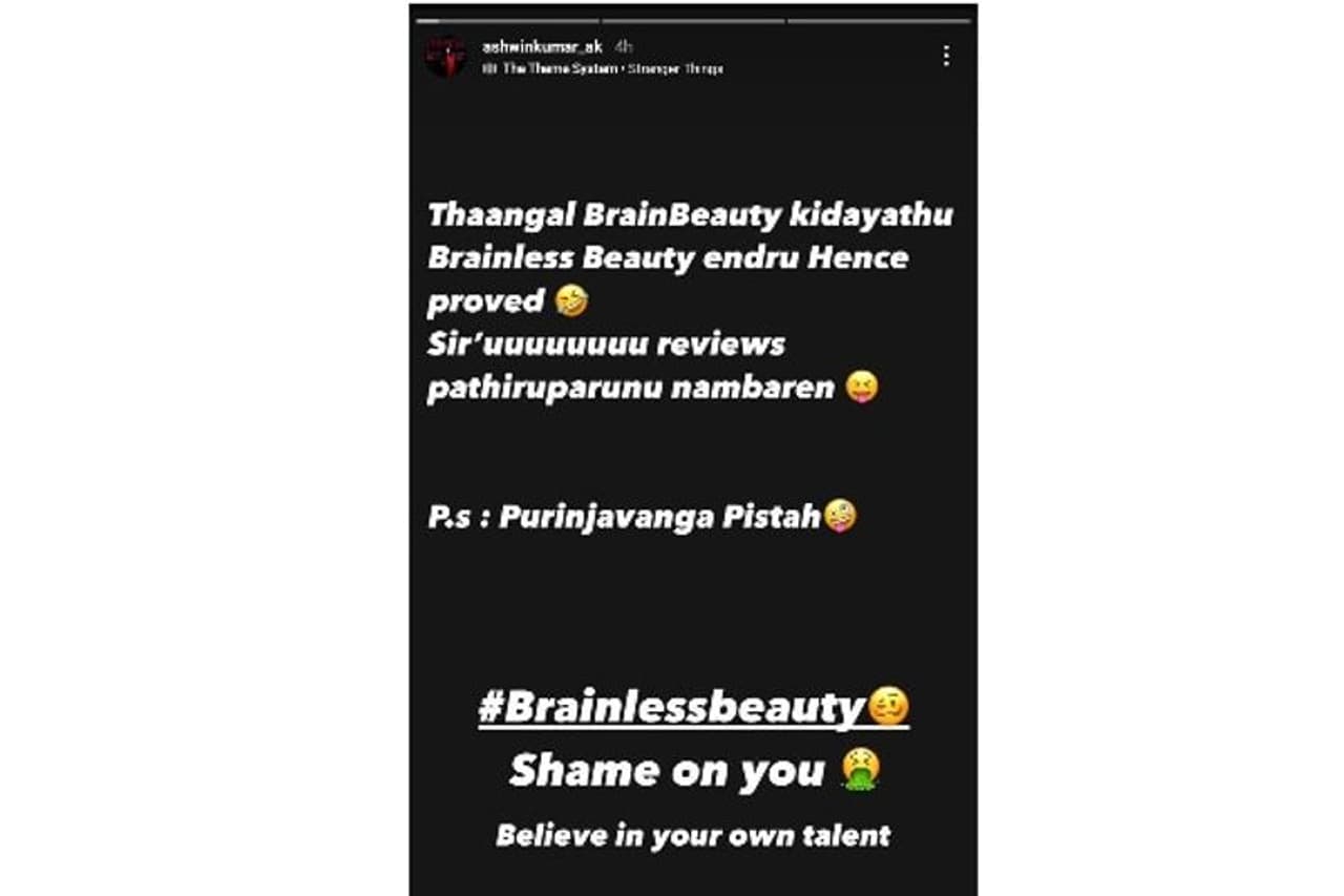 இந்நிலையில், சமீபத்தில் அறிவழகன் இயக்கத்தில் வெளியான தமிழ் ராக்கர்ஸ் வெப் சீரிஸில் அஸ்வினை கிண்டலடிக்கும் விதமாக ஒரு காட்சி இடம்பெற்று இருக்கும். அதில், தன் மகனுக்கு சினிமா சான்ஸ் கேட்பதற்காக ஒருவர் தனது மகனின் போட்டோவை காட்டி, “சார் இவன் பேரு அஸ்வின் குமார், அவனே ஏகே-னு சொல்லிகிடுவான். போட்டோல பார்த்தா தூங்குன மாதிரிதான் இருப்பான். ஆனா நேர்ல நல்லா இருப்பான்” என்று வசனம் பேசியிருப்பார்.