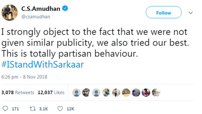’ஸ்டேண்ட் வித் சர்கார்’ என்ற ஹேஷ்டேக்கில் இதைப்பகிர்ந்த அமுதன்,’ ஒரே செயலைச் செய்த இருவருக்கு நீங்கள் அளித்திருக்கும் விளம்பரம் பாரபட்சமாக இருக்கிறது. நாங்களும் சர்கார் மாதிரி எங்களால் முடிந்த அளவுக்கு உங்கள வச்சு தான செஞ்சோம்’ என்கிறார்.