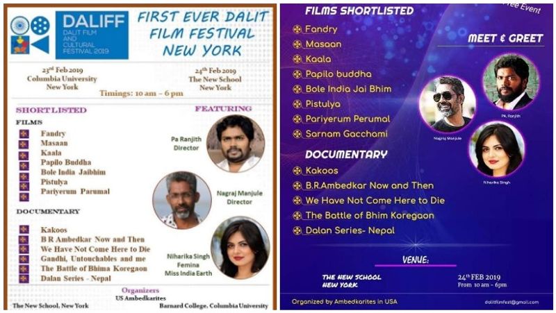 நியூயார்க்கில் அடுத்த மாதம் 23, 24ம் தேதிகளில் தலித் ஃபிலிம் ஃபெஸ்டிவல் நடக்க இருக்கிறது. இதில் தலித்தியம் திரைப்படங்களும் குறும்படங்களும் திரையிடப்பட உள்ளன. இதற்காக 7 திரைப்படங்கள் தேர்வாகி உள்ளன. அதில் தமிழில் இருபடங்கள் தேர்வு செய்யப்பட்டுள்ளன. பா.ரஞ்சித் தயாரிப்பில் மாரி செல்வராஜ் இயக்கிய பரியேறும் பெருமாள், ரஜினி நடிப்பில் பா.ரஞ்சித் இயக்கிய காலா ஆகிய படங்கள் தலித் பட வரிசையில் சேர்க்கப்பட்டுள்ளன. பரியேறும் பெருமாள் தலித்தியம் பேசும் கதை. ஆகையால் இந்த பட வரிசையில் இடம்பெற்றது ஆச்சர்யமில்லை.