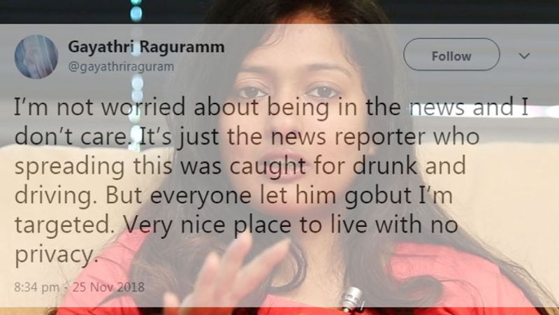 'எதையோ மறைக்க நான் செய்தியாக்கப்பட்டுள்ளேன். பேனாவும் பத்திரிகையும் பலமானதாக இருக்கலாம். ஆனால், எனது ஆன்மாவைவிட வாழ்க்கையைவிட எதுவும் வலுவானது இல்லை.என்ன வேண்டுமானாலும் எழுதுங்கள். நான் துணிச்சலுடன் வாழ்வேன். இந்த பொய் செய்தியை உருவாக்கிய செய்தியாளர்தான் போதையில் இருந்தார்’ என்கிறார் காயத்ரி.