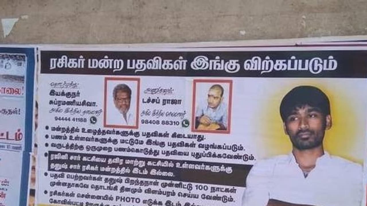 ரசிகர் மன்ற பதவிகள் இங்கு விற்கப்படும் என்ற தலைப்பிட்டு தனுஷ் ரசிகர் மன்றத்தினர் பெயரில் சென்னை முழுவதும் ஒட்டப்பட்டிருக்கும் பெரிய பெரிய போஸ்டர்கள் அரசியல் வட்டாரத்தில் பெரும் பரபரப்பை ஏற்படுத்தியுள்ளது.