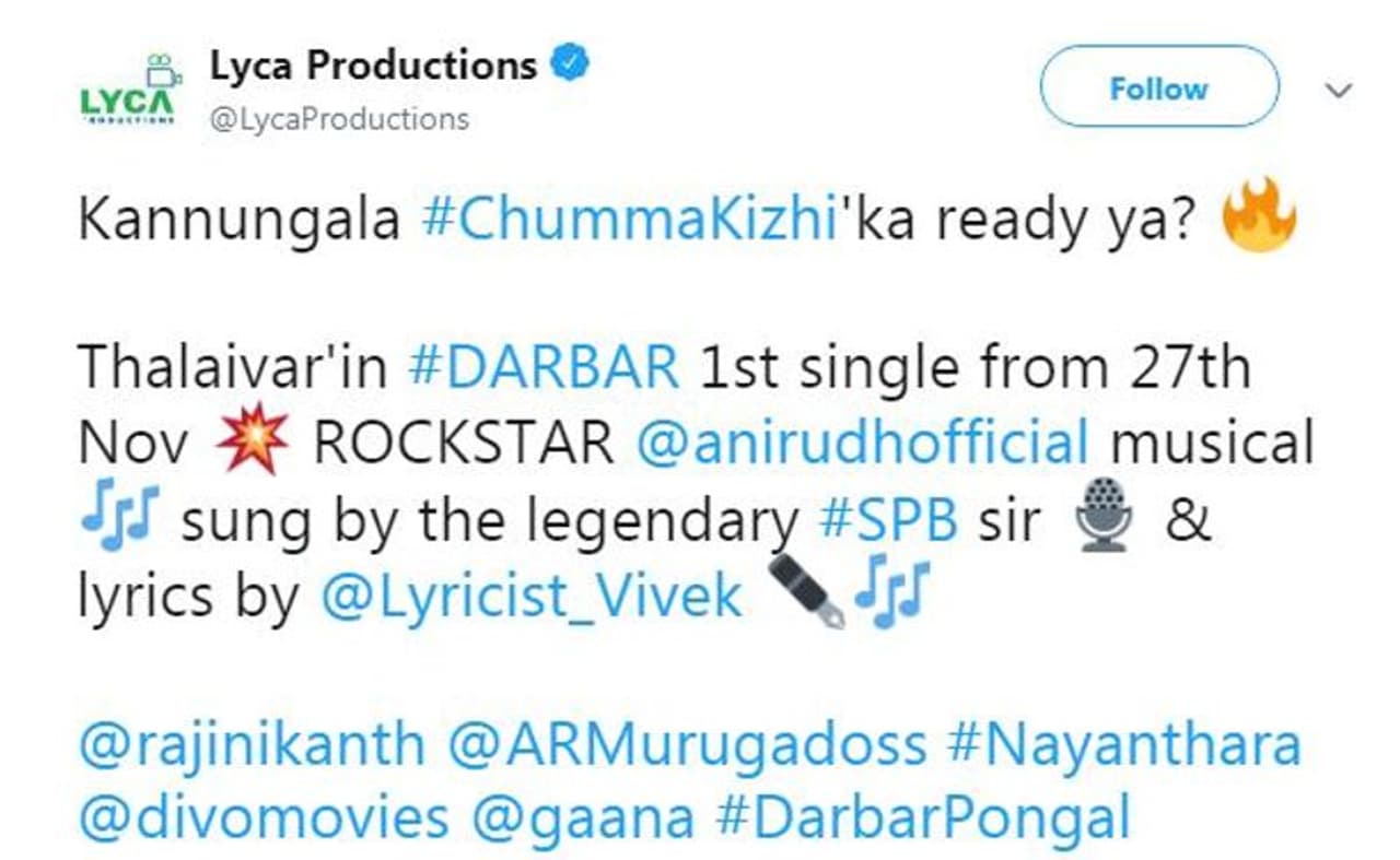 இந்த அறிவிப்பு வெளியான அடுத்த நொடியே, டுவிட்டரில் தர்பார் என்ற ஹேஷ் டேக்கை உருவாக்கி தலைவர் ரசிகர்கள் ட்ரெண்டிங் செய்து கொண்டாடி வருகின்றனர். பாடல் வரிக்கு ஏற்ப முதல் சிங்கிள் ட்ராக்கும் சும்மா கிழித்து தொங்கவிடும் என நாமும் எதிர்பார்க்கலாம்.