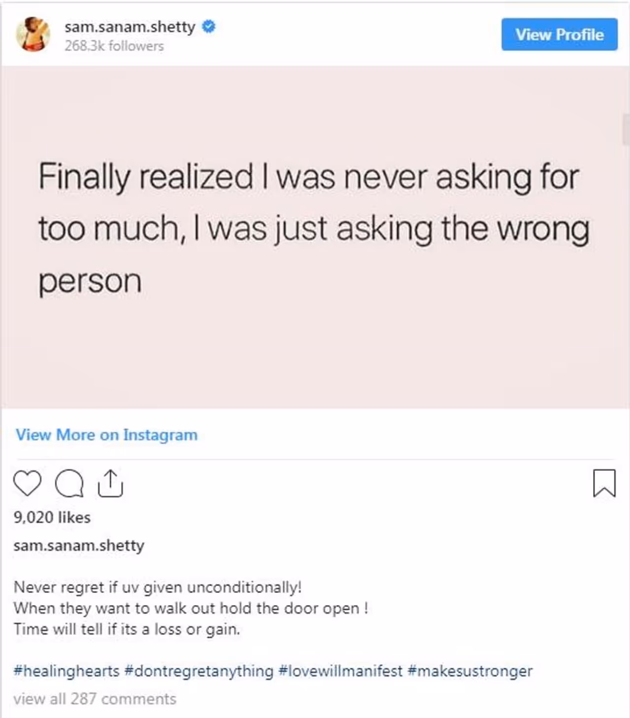 அவர் ஷேர் செய்துள்ள ஒரு போஸ்ட்டில், "நான் அதிகம் கேட்கவில்லை, தவறான நபரிடம் கேட்டுக் கொண்டிருந்தேன் என்பதை புரிந்து கொண்டேன். அளவே இல்லாமல் கொடுத்திருந்தால் வருத்தப்பட வேண்டாம். விலகிச் செல்ல நினைத்தால் விட்டுவிடுங்கள்.
