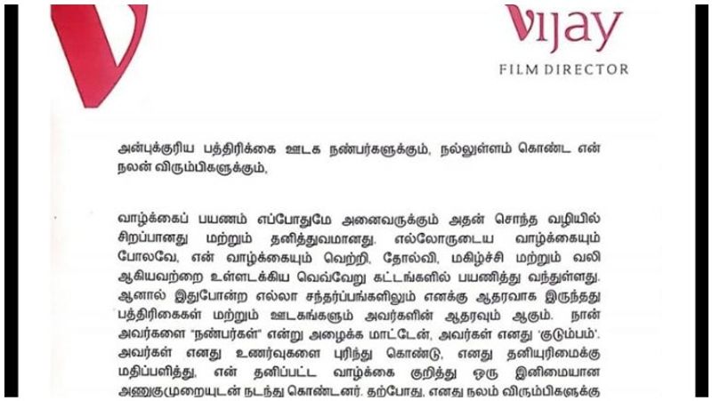 ’என் வாழ்வின் முக்கியமான துவக்கத்தைப் பற்றிய மகிழ்ச்சியான செய்தியை பத்திரிகையாளர்களாகிய உங்களுடன் மகிழ்ச்சியாக பகிர்ந்துகொள்ள விரும்புகிறேன்’ என்று தனது திருமணச் செய்தியை உறுதி செய்யும் கடிதம் ஒன்றை அத்தனை ஊடகங்களுக்கும் சற்றுமுன்னர் அனுப்பியுள்ளார் இயக்குநர் ஏ.எல்.விஜய்.