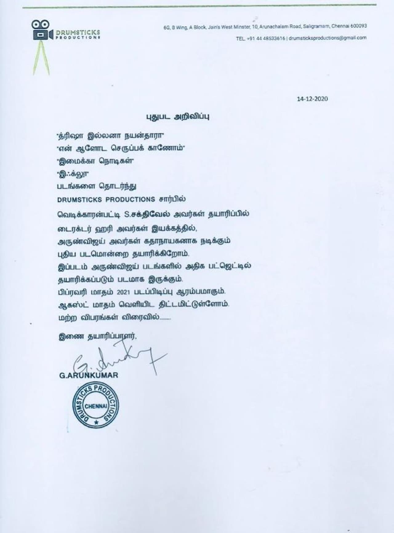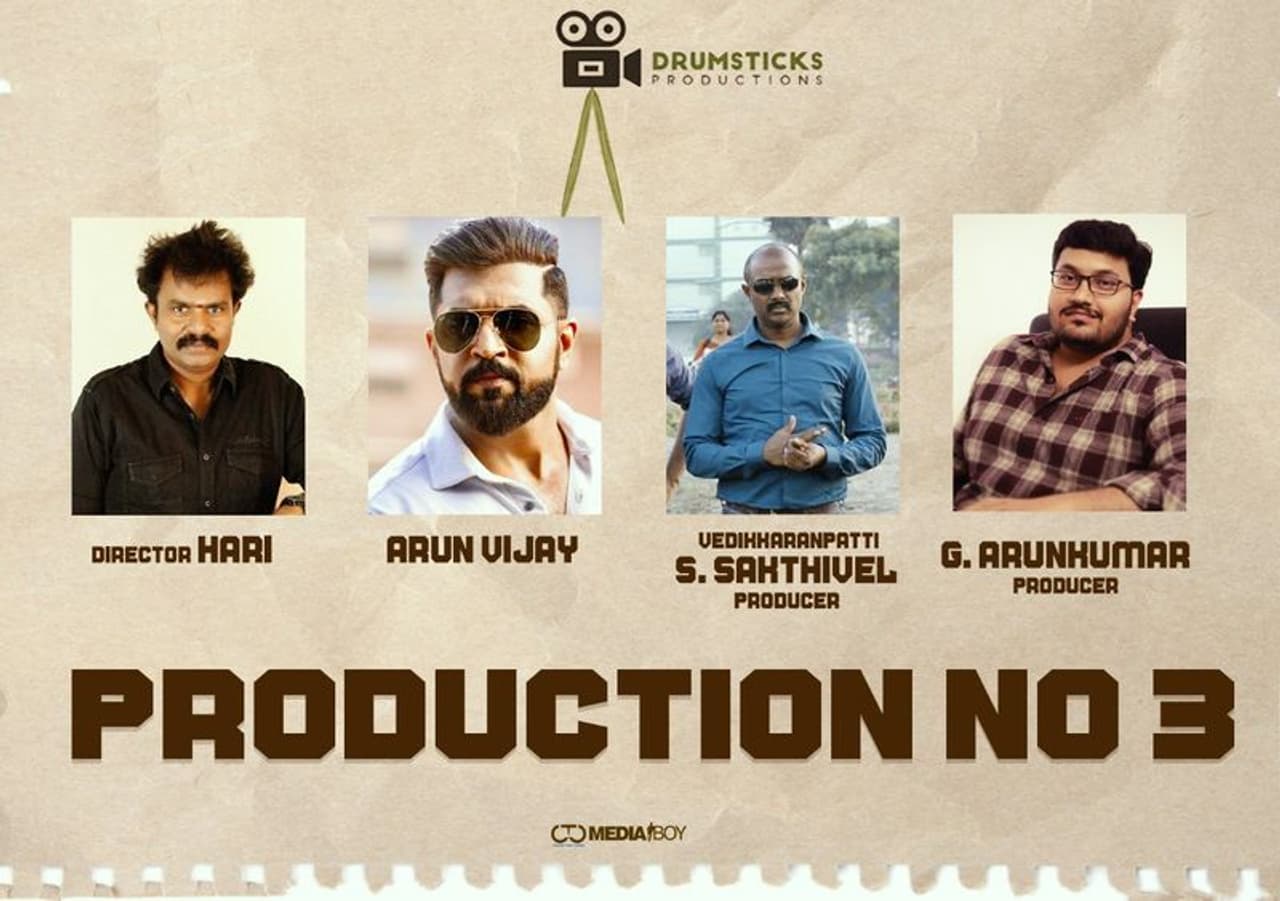 இதுகுறித்து தயாரிப்பு நிறுவனம் வெளியிட்டுள்ள அறிக்கையில், த்ரிஷா இல்லனா நயன்தாரா, என் ஆளோட செருப்பக் காணோம், இமைக்கா நொடிகள், இஃக்லூ படங்களை தொடர்ந்து Drumsticks productions சார்பில் வெடிக்காரன்பட்டி எஸ். சக்திவேல் அவர்கள் தயாரிப்பில் டைரக்டர் ஹரி அவர்கள் இயக்கத்தில், அருண் விஜய் அவர்கள் கதாநாயகனாக நடிக்கும் புதிய படமொன்றை தயாரிக்கிறோம்.